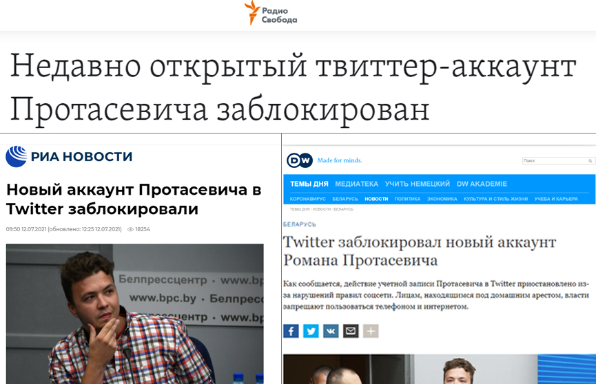 А все потому, что про закрытие, автоцитата, «написали «Радио Свобода», «Дойче Велле» и РИАН». Это про Твиттер Протасевича!