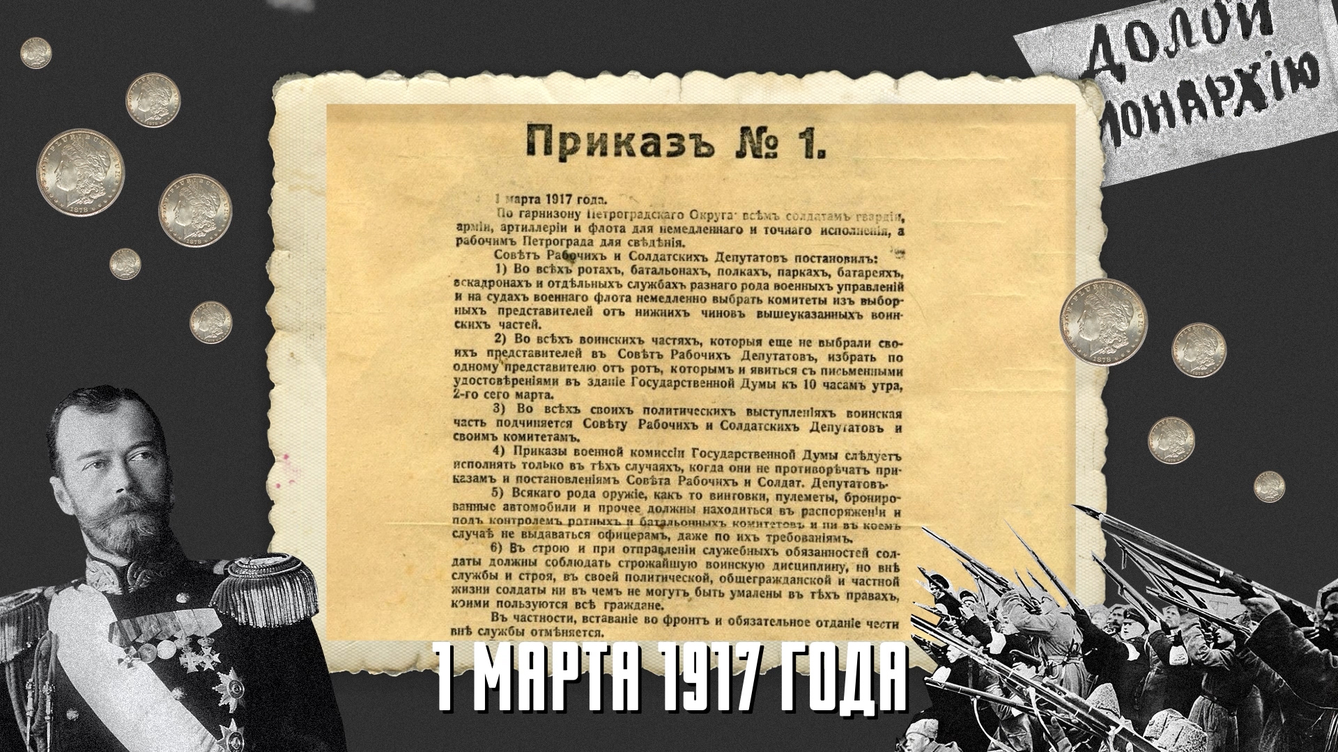 В этот же день Петроградский совет издает знаменитый приказ № 1, который положил начало резкому падению дисциплины в армии и понизил ее боеспособность. О чем документ? Создать комитеты из низших чинов, то есть им всю власть, в их же распоряжении все оружие – офицерам не выдавать, отдавать честь вне службы не обязательно и так далее.