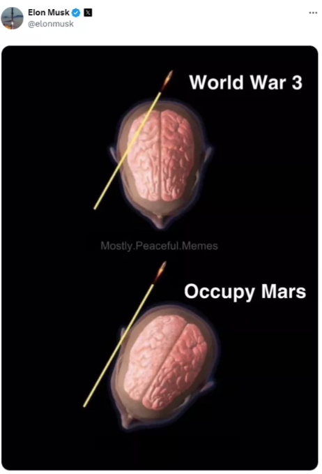 В своем аккаунте в социальной сети X Илон Маск, американский предприниматель-миллиардер, поделился своими мыслями о том, что он предпочел бы заниматься освоением Марса, а не участвовать в развязывании глобального конфликта.