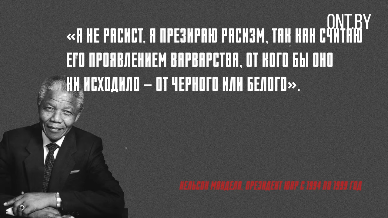 «Я не расист, я презираю расизм, так как считаю его проявлением варварства, от кого бы оно ни исходило – от черного или белого». (Нельсон Мандела, Президент ЮАР с 1994 по 1999 год)