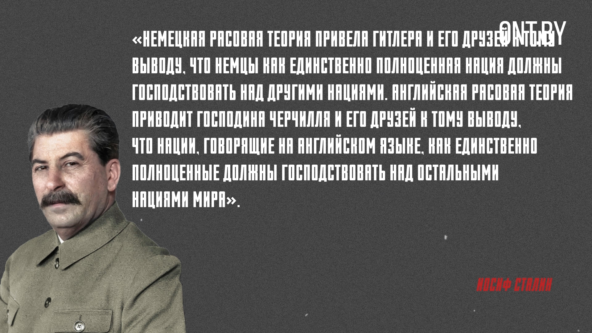 «Немецкая расовая теория привела Гитлера и его друзей к тому выводу, что немцы как единственно полноценная нация должны господствовать над другими нациями. Английская расовая теория приводит господина Черчилля и его друзей к тому выводу, что нации, говорящие на английском языке, как единственно полноценные должны господствовать над остальными нациями мира».