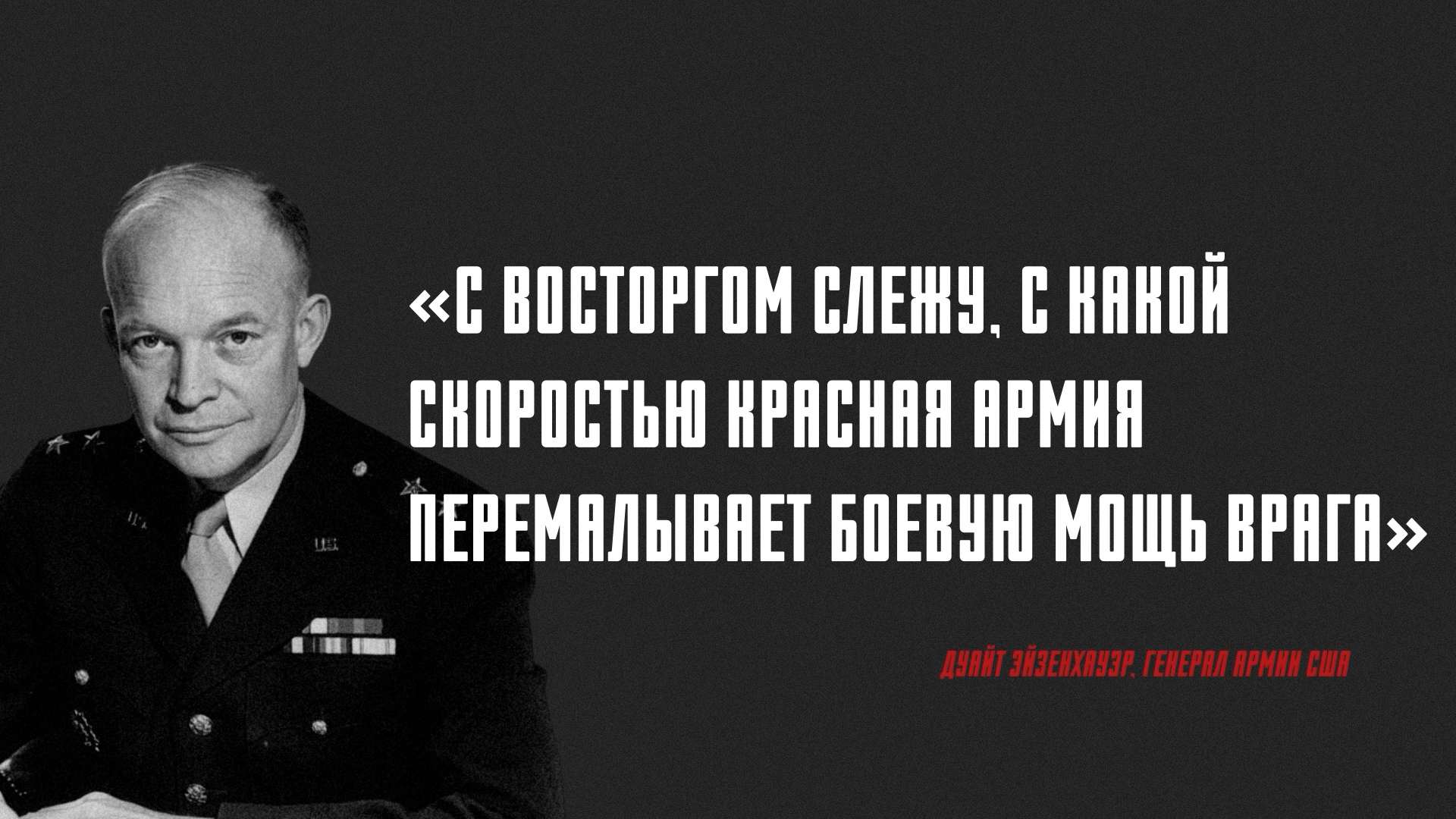 На тот еще момент генерал армии США Дуайт Эйзенхауэр говорил: «С восторгом слежу, с какой скоростью Красная Армия перемалывает боевую мощь врага».
