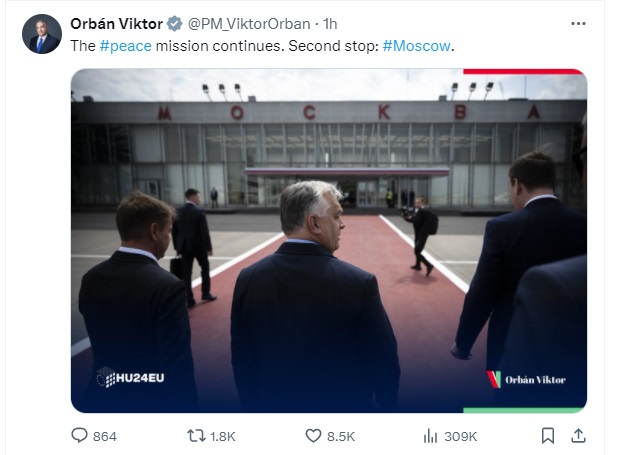 «Мирная миссия продолжается. Следующая остановка – Москва», – написал Орбан.