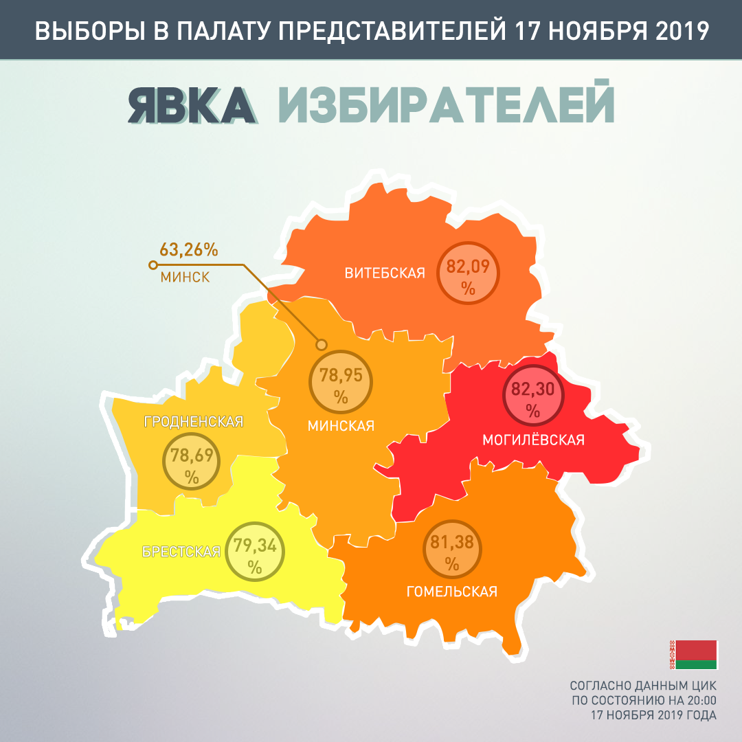 Будущее страны определяли сегодня белорусы, мы выбирали новый состав парламента. Голосование завершилось в 20:00 по минскому времени. И на всех 110 избирательных округах выборы состоялись – это значит, что на участки пришли более половины внесённых в списки избирателей. Как только что сообщили в Центризбиркоме, явка по стране составила более 77%. Это самые последние данные!