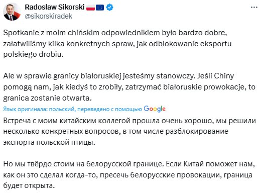 В своем сообщении в Х он подчеркнул, что в этом Польше должен помочь Китай. К таким выводам Сикорский пришел после встречи с министром иностранных дел Китая Ван И.