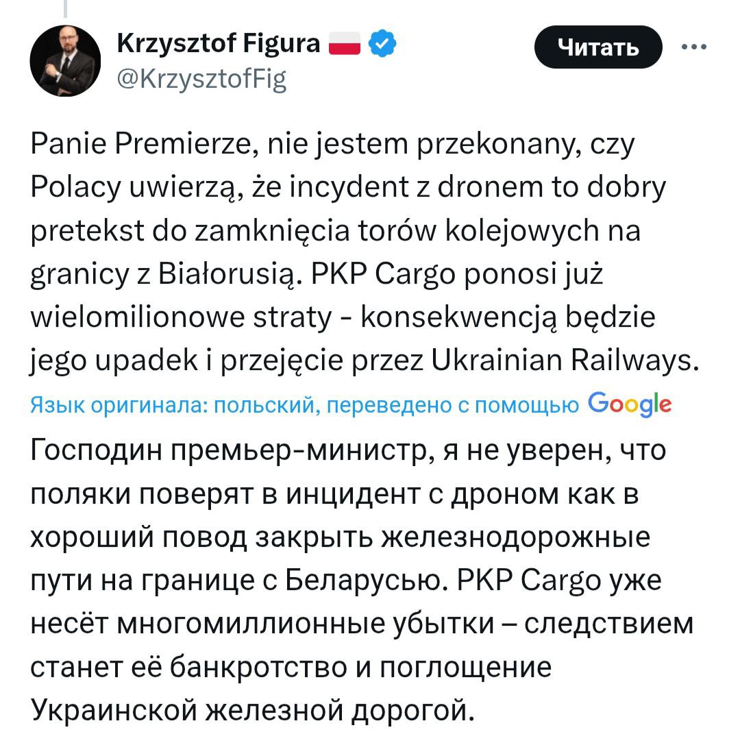 «Премьер-министр, я не уверен, что поляки поверят, что инцидент с беспилотником является хорошим предлогом для закрытия железнодорожных путей на границе с Беларусью. PKP Cargo уже несет многомиллионные убытки. Следствием этого станет его падение и поглощение Украинскими железными дорогами», – написал один из комментаторов.