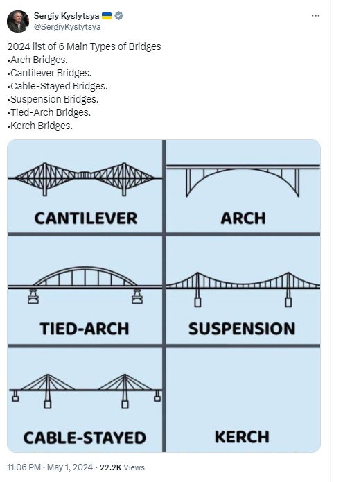 Кислица написал список «шести типов мостов на 2024 год»: арочные, консольные, вантовые, подвесные, связанные арочные и керченские. Все из них сопровождаются картинкой с изображением моста, кроме последнего. Под надписью «Керченский мост» – пустая картинка.