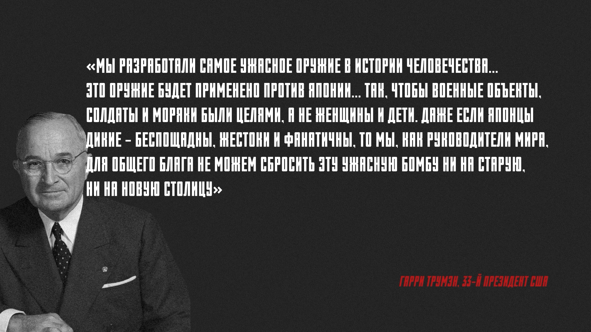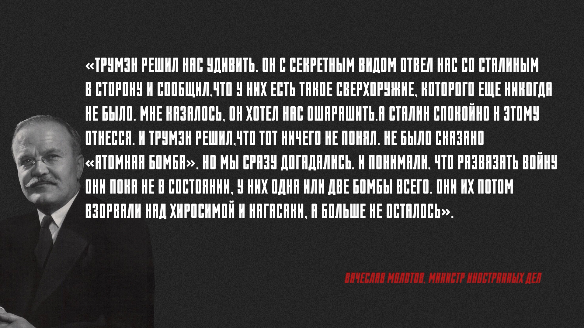 «Трумэн решил нас удивить. Он с секретным видом отвел нас со Сталиным в сторону и сообщил, что у них есть такое сверхоружие, которого еще никогда не было. Мне казалось, он хотел нас ошарашить. А Сталин спокойно к этому отнесся. И Трумэн решил, что тот ничего не понял. Не было сказано «атомная бомба», но мы сразу догадались. И понимали, что развязать войну они пока не в состоянии, у них одна или две бомбы всего. Они их потом взорвали над Хиросимой и Нагасаки, а больше не осталось».