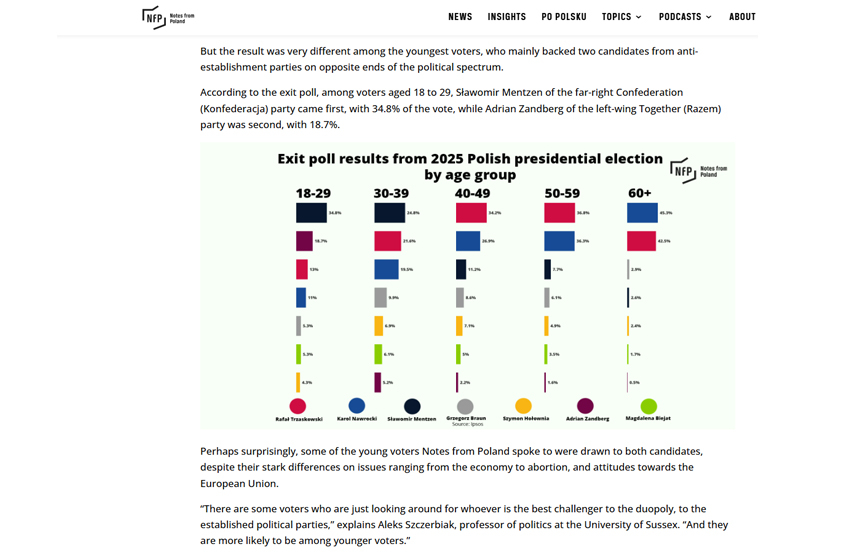 Согласно имеющейся информации, активнее всего молодежь поддерживала Славомира Ментцена из крайне правой партии «Конфедерация» (Konfederacja). За него проголосовали 34,8% избирателей в возрасте до 30 лет.