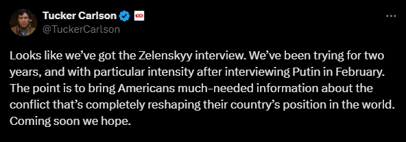 Карлсон в соцсети Х анонсировал интервью с Зеленским. Он отметил, что пробовал записать разговор в течение двух лет, но особенно после интервью с Владимиром Путиным, которое журналист опубликовал в феврале.