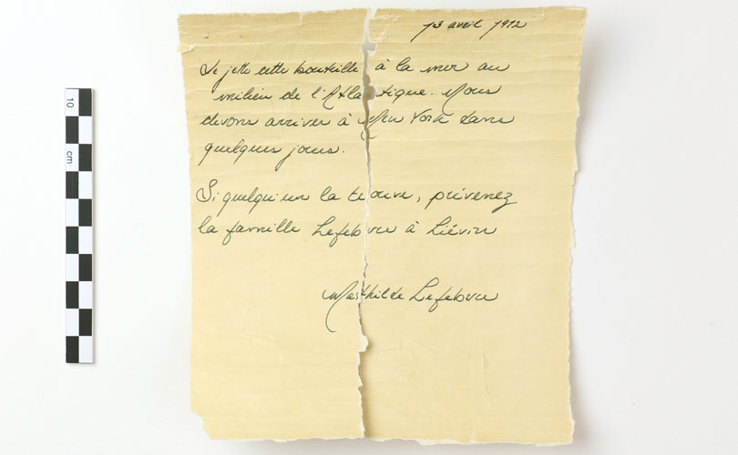 В бутылке было письмо, датируемое 13 апреля 1912 года и написанное от лица девочки Матильды Лефевр. По информации специалистов, девочка с этим именем была пассажиркой третьего класса «Титаника». Ученые связались с живущими родственниками Матильды.