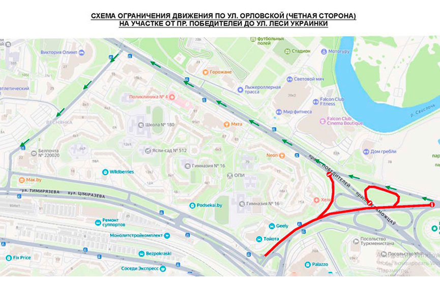 - С 21:00 10 сентября до 05:20 11 сентября – движение будет закрыто по нечетной стороне ул. Орловской на участке от ул. Тимирязева до развязки с проспектом Победителей, включая съезд с Тимирязева на нечетную сторону Орловской.