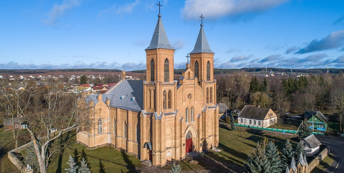 Он расположился в агрогородке Трабы Ивьевского района. Проезжая мимо этого монументального здания, если не поднимать голову вверх, обращая внимание на венчающие его кресты, можно подумать, что это замок. Построен он в начале прошлого века, выполнен в неоготическом стиле. Костел примечателен двумя остроконечными башнями, контрфорсами, фигурным щитом и стрельчатыми окнами. А внутри находится резной неоготический алтарь и орган. Кроме того, здесь хранятся иконы XIX века.