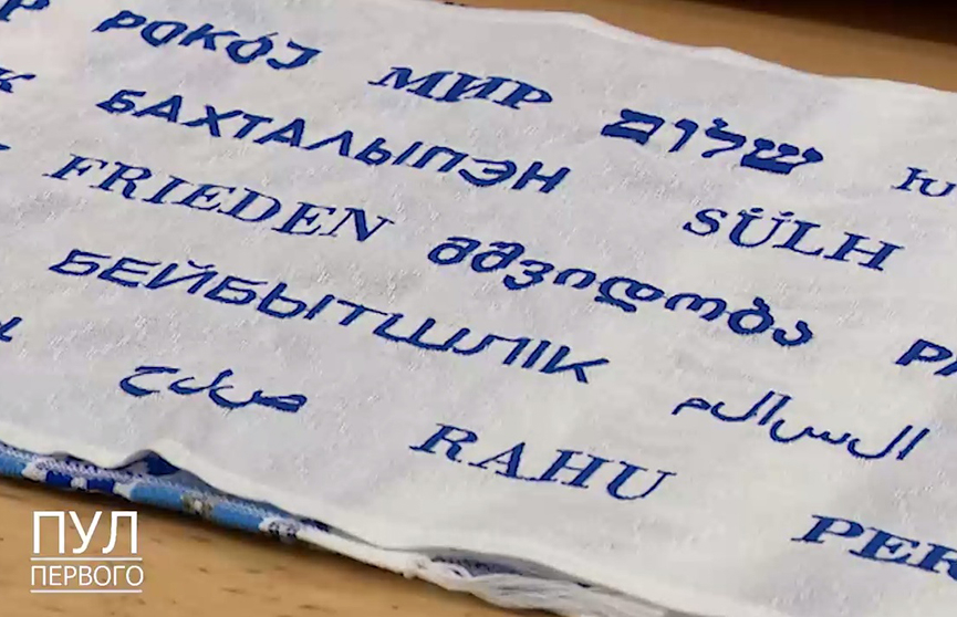 Александру Лукашенко подарили рушник, на котором слово «мир» вышито на 26 языках