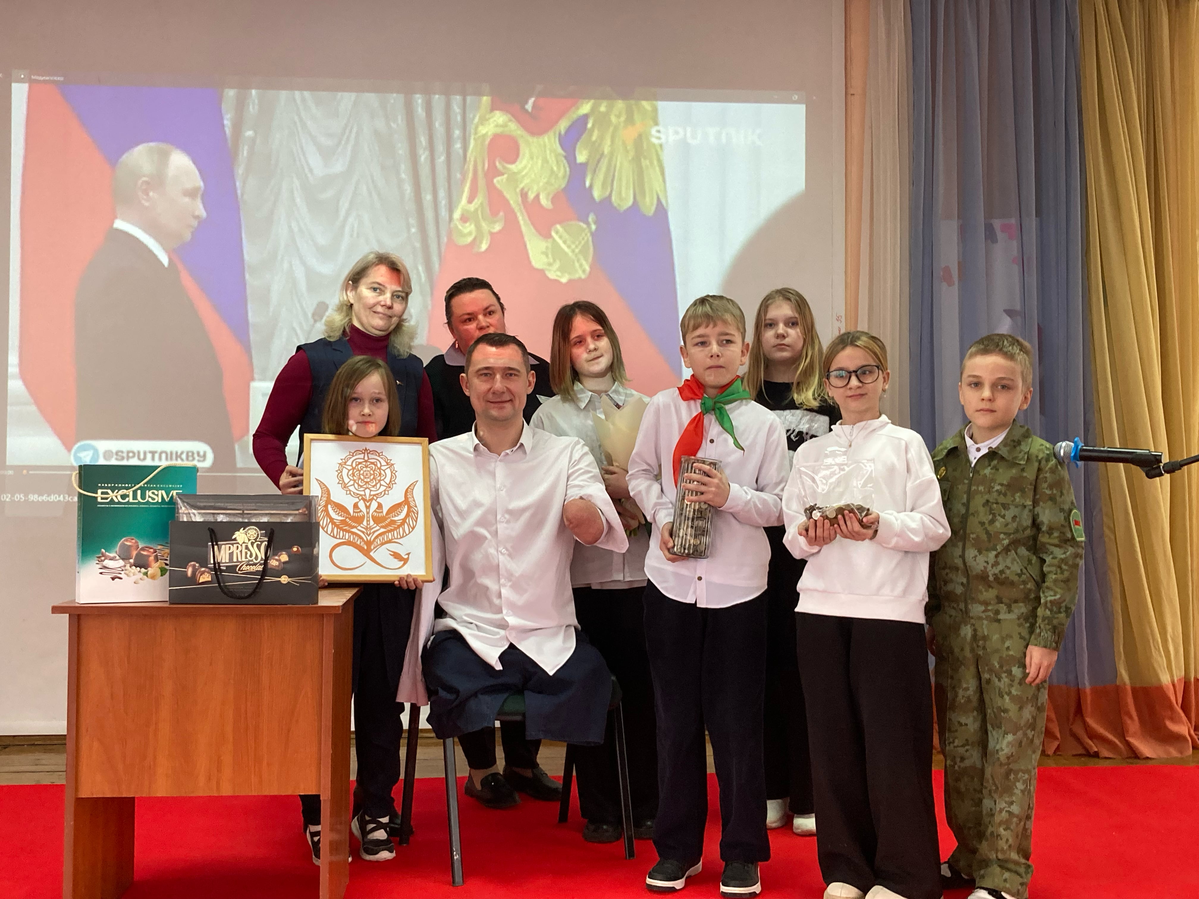 На память о встрече гимназисты вручили Алексею Талаю вытинанку с эмблемой его фонда.