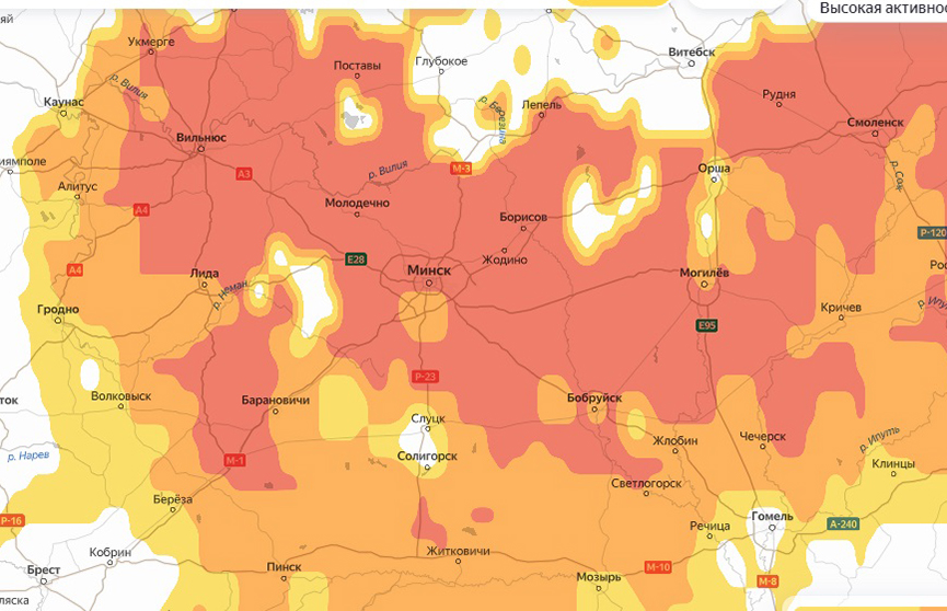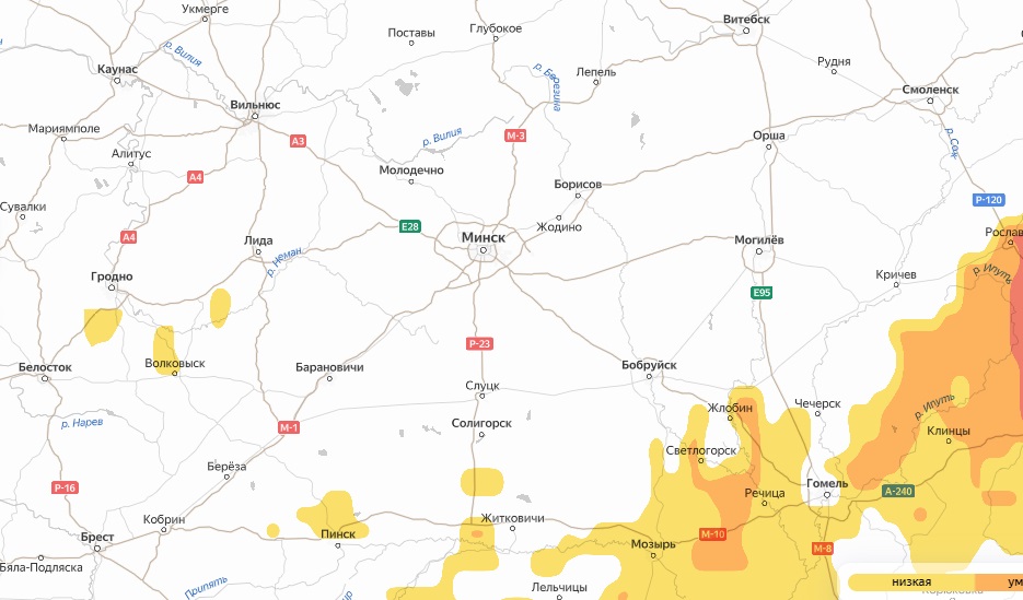 Во вторник, 10 июня, почти вся карта окрасилась в красный цвет. Больше всего под «удар» пыльцы попала центральная часть – столичный регион, Гродненщина и Могилевщина.
