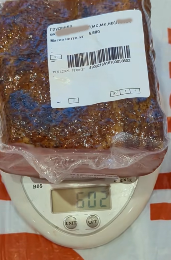 Оказалось, что на заводской упаковке был указан правильный вес продукта. А вот на наклейке от магазина – грубейшая ошибка. «Хитрым движением руки» 588 граммов превратились в 5880 граммов. Отсюда и такая большая цифра в чеке.