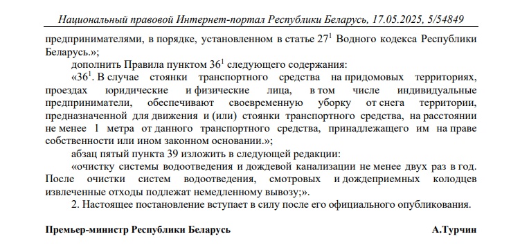 «В случае стоянки транспортного средства на придомовых территориях, проездах юридические и физические лица, в том числе индивидуальные предприниматели, обеспечивают своевременную уборку от снега территории, предназначенной для движения и (или) стоянки транспортного средства, на расстоянии не менее 1 метра от данного транспортного средства, принадлежащего им на праве собственности или ином законном основании», – указано в тексте документа.