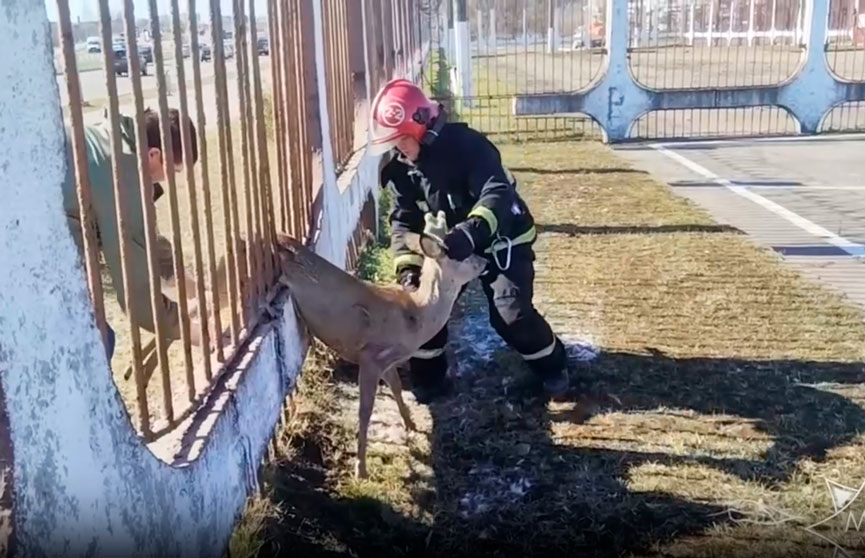 В Борисове косуля застряла в металлическом ограждении, и помочь смогли только сотрудники МЧС.