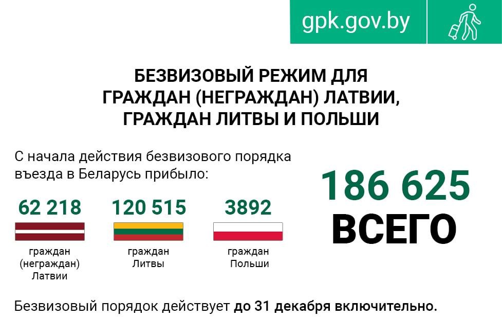 На 15 августа 00:00 правом безвизового въезда в Беларусь воспользовались 186 625 граждан Литвы, Латвии, Польши. С 15 апреля в Беларусь по безвизу приехали 120 515 граждан Литвы,