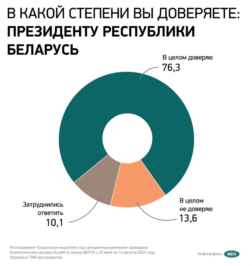На вопрос «В какой степени вы доверяете Президенту?» 76,3% белорусов ответили «В целом доверяю», 13,6% респондентов ответили «В целом не доверяю», еще 10,1% затруднились ответить.