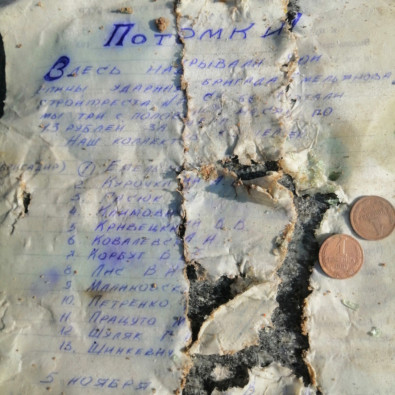 Текст послания сохранился не полностью. «Здесь надрывали свои спины ударная бригада Емельянова стройтреста… Работали мы три с половиной месяца по 13 рублей за смену. Наш коллектив…», – далее перечислены фамилии строителей, которые заложили бутылку в цемент под плитой. Две монеты прилагались на память.