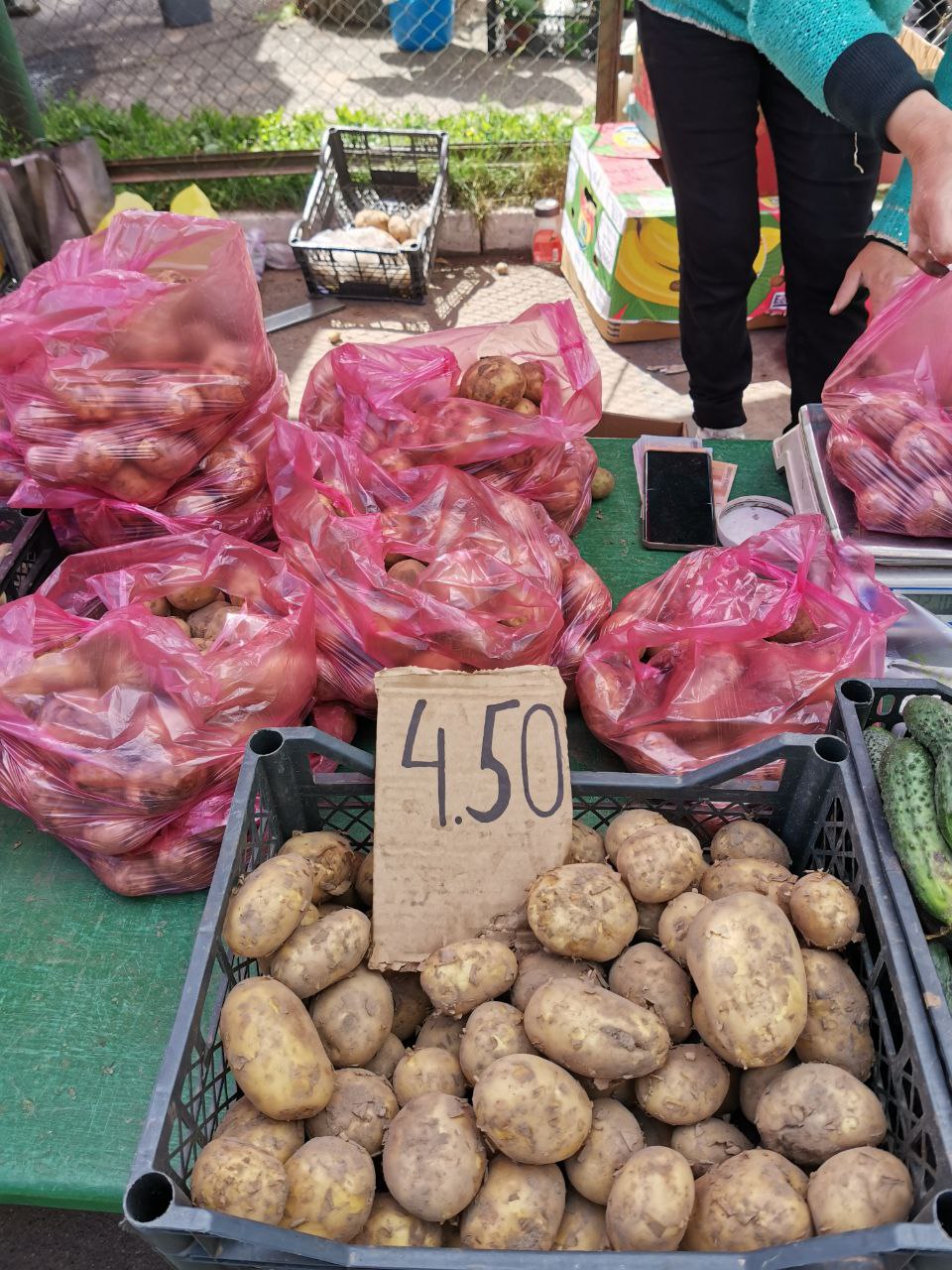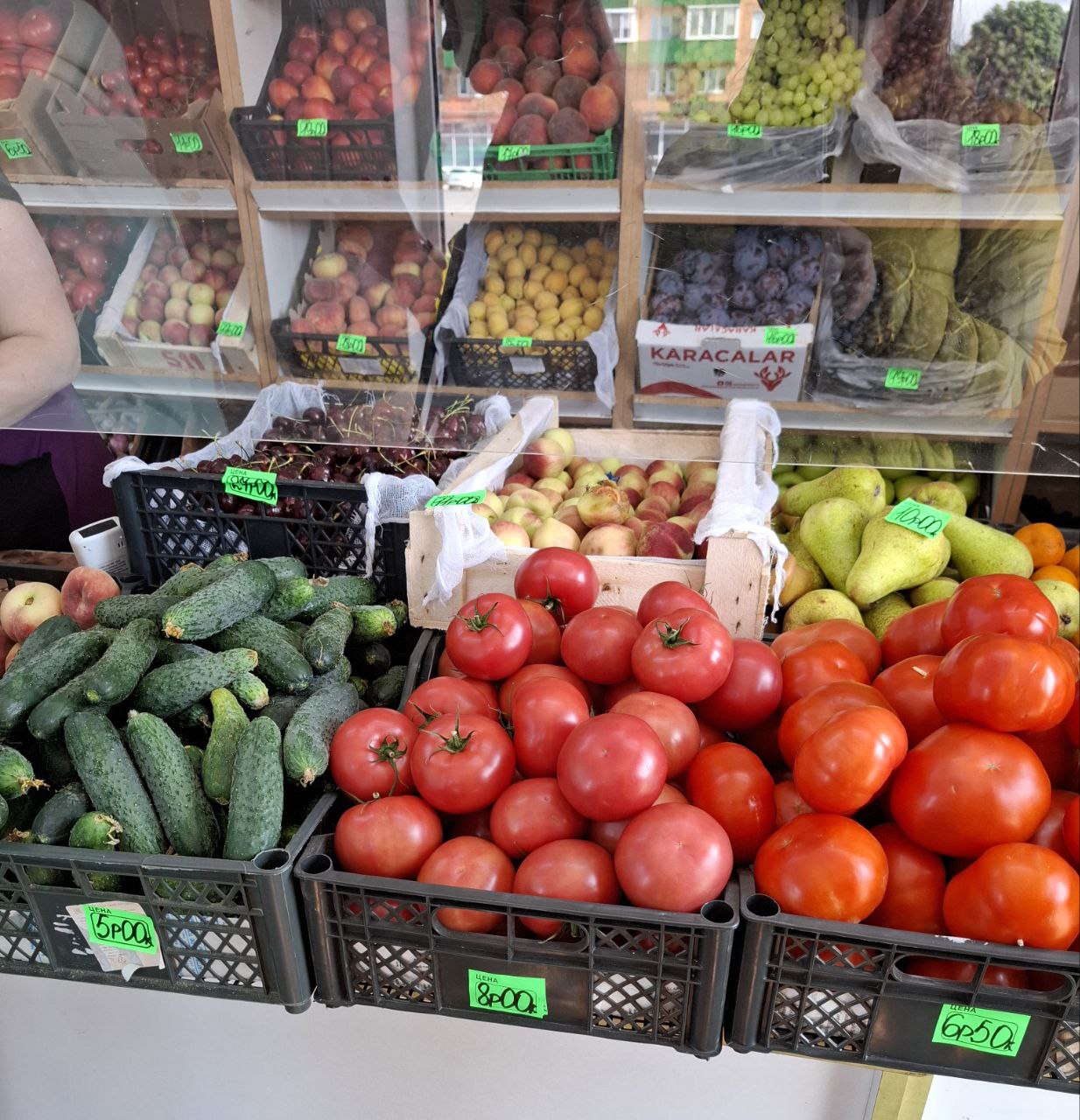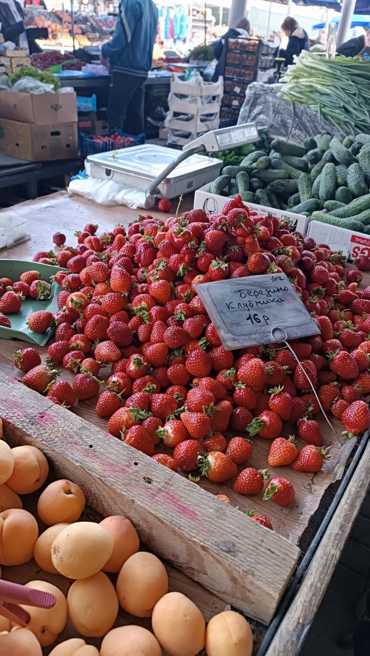 Клубнику предлагает местный фермер – цена варьируется от 10р./кг до 20р./кг в зависимости от качества ягод. Цена на картофель: 6р./кг стоит фермерский, 3,90р./кг – привозной из Грузии. Помидоры продают по 6,50р. – 8р./кг привозные, фермерские – за 8р. – 12р./кг. Цена на огурцы: фермерские продают по 6,50р./кг, привозные – по 5р./кг. Абрикос стоит 8,50р./кг, черешня – 27р./кг, яблоки – 6,70р./кг, персик – 17р./кг, нектарин – 19р./кг.