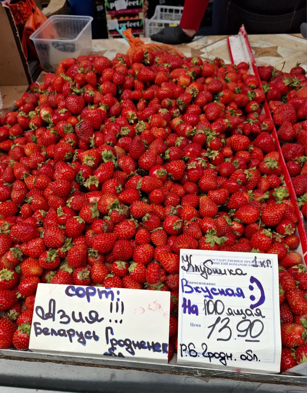 Перемещаемся в Гродненскую область. Цены на сезонном рынке там такие: клубнику продают по 18р./кг, картофель – 4р. – 5р./кг, огурцы продают по 5,50р./кг, помидоры стоят 6,50р. – 8,50р./кг, лук за 3,50р./кг, капуста – 3,50р./кг, абрикосы – 10р./кг.