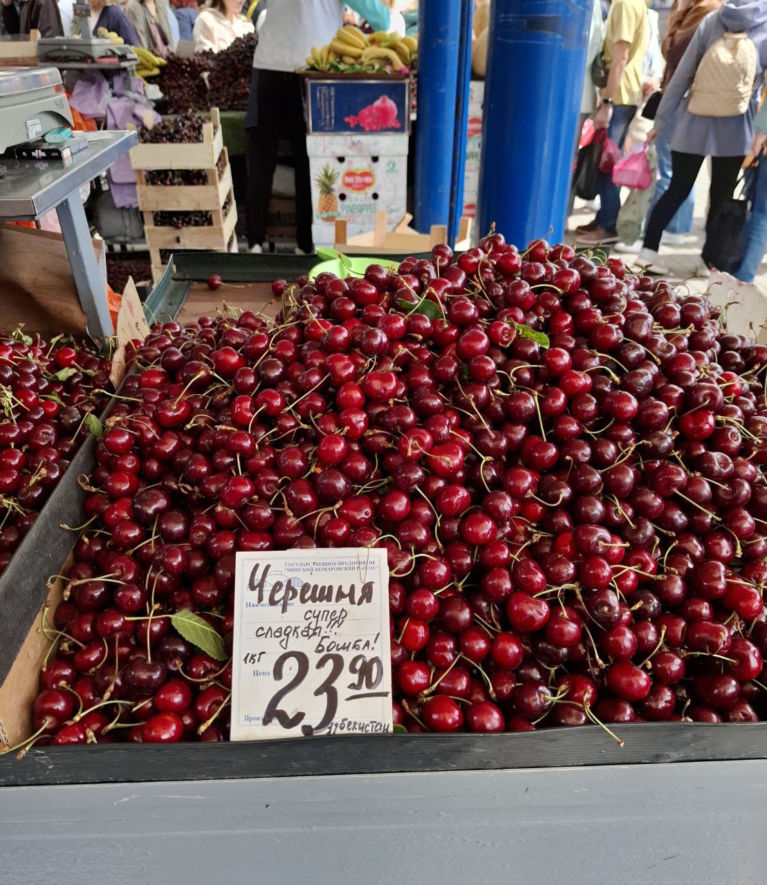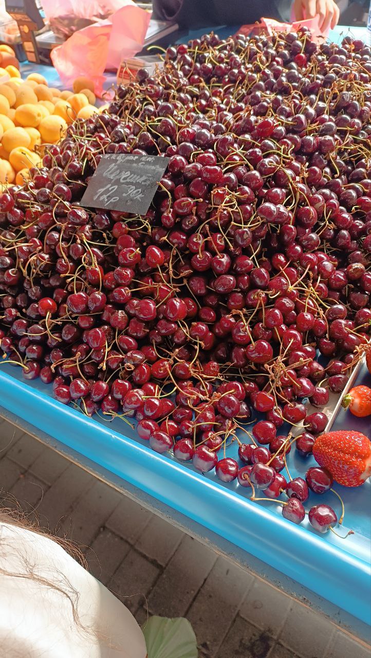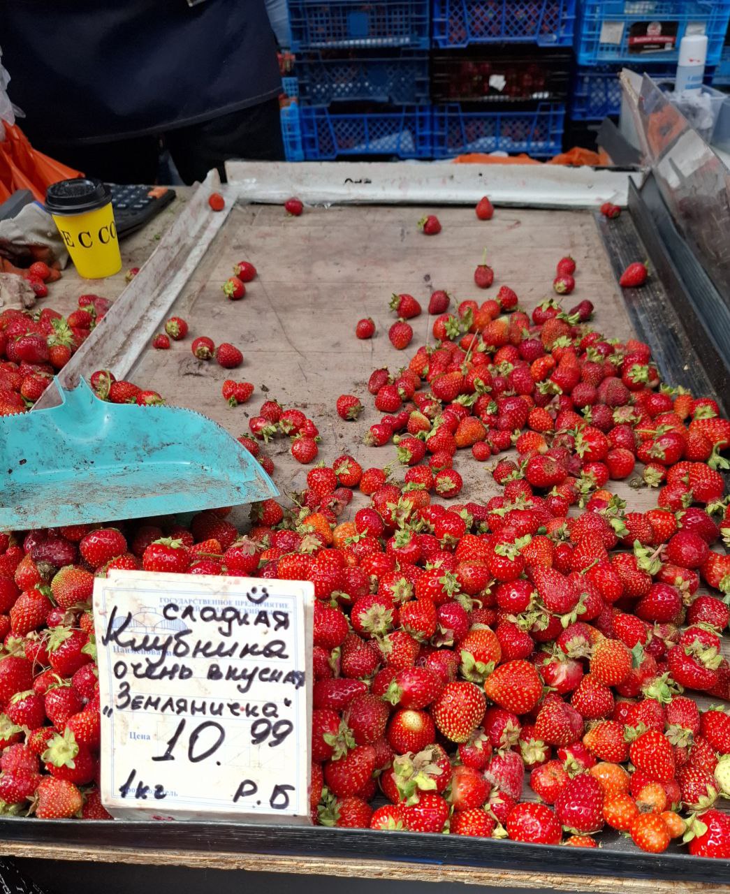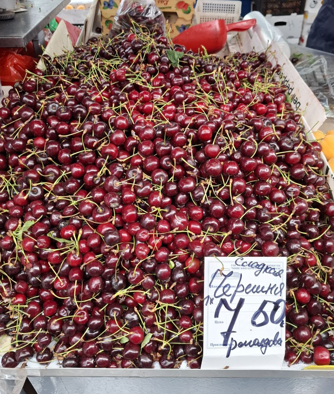 Начнем обзор со всеми любимой клубники, цены на нее очень разные: начиная от 25р./кг и заканчивая ягодой на варенье за 11р./кг. Стоимость черешни существенно снизилась – найдена ягода по 7,50р./кг, крупная стоит 24р./кг. А вот две недели назад черешня была по 15,90р. – 27р./кг.