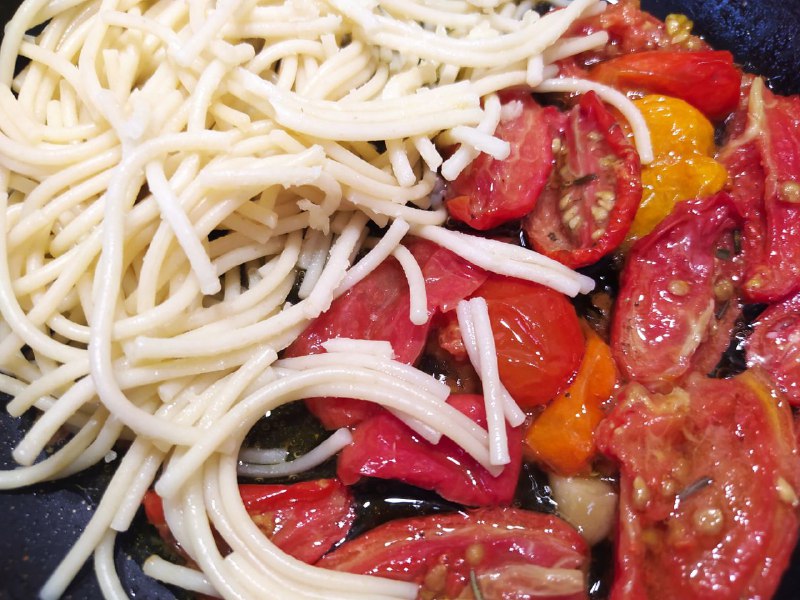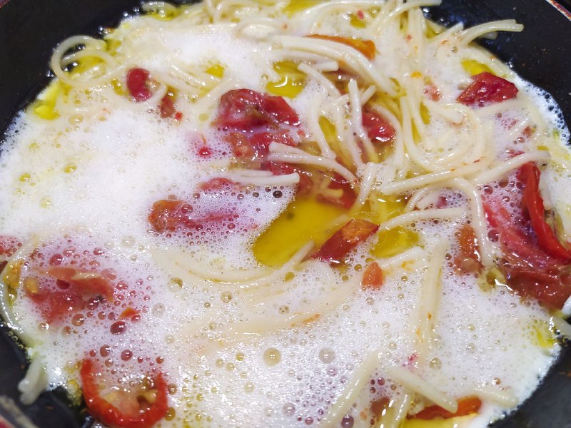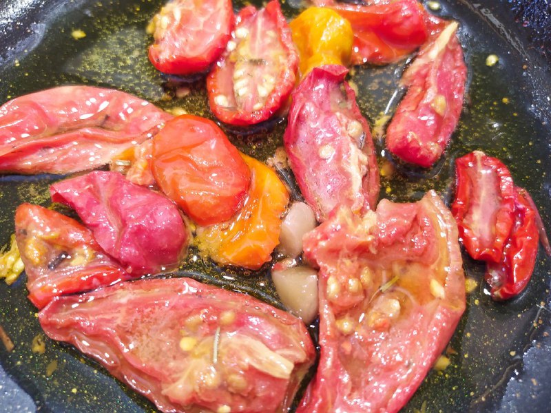1. Вяленые помидоры выложить на сковороду, дать оливковому маслу разогреться.