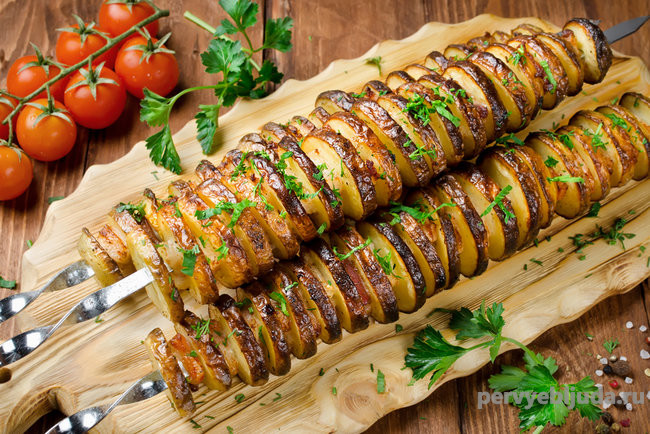 Какой же отдых на природе без картошки на углях? Для блюда подойдет молодой картофель с тонкой кожицей. Чтобы блюдо получилось сочным и вкусным, чередуйте ломтики картошки с тонкими кусочками бекона или сала с мясной прослойкой.