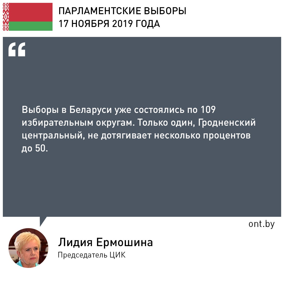 Парламентские выборы Национального собрания Беларуси седьмого созыва состоялись в 109 округах из 110, сообщает председатель ЦИК Лидия Ермошина.