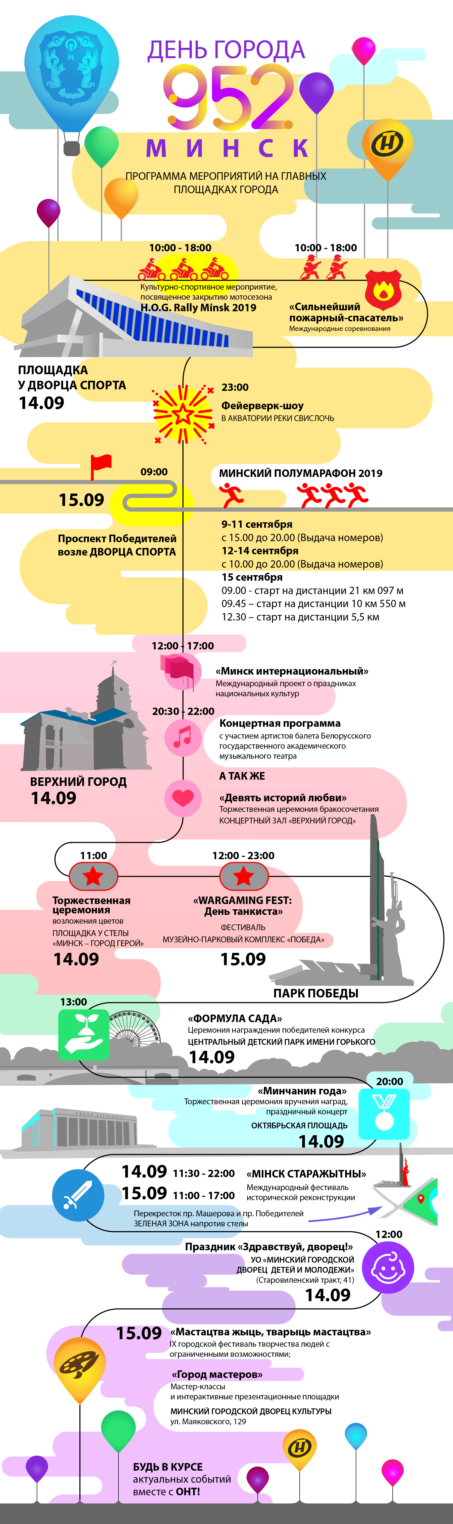Предстоящие выходные будут насыщенными на события. Минск отмечает 952 годовщину! Мотофестиваль "HOG Rally Minsk", выступление The Offspring, Nuteki, "Зверей" и других крутых артистов. А еще концерты в Верхнем городе, "День танкиста", выставки, фестиваль исторической реконструкции "Мiнск старажытны", соревнования спасателей и Минский полумарафон. В общем, пользуйтесь программой праздника от ОНТ и отмечайте интересные вам места на 13 и 14 сентября.