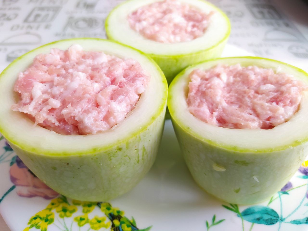 2). Фарш посолить, добавить специи, хорошенько перемешать. Заполнить сердцевину каждого кабачкового стаканчика.