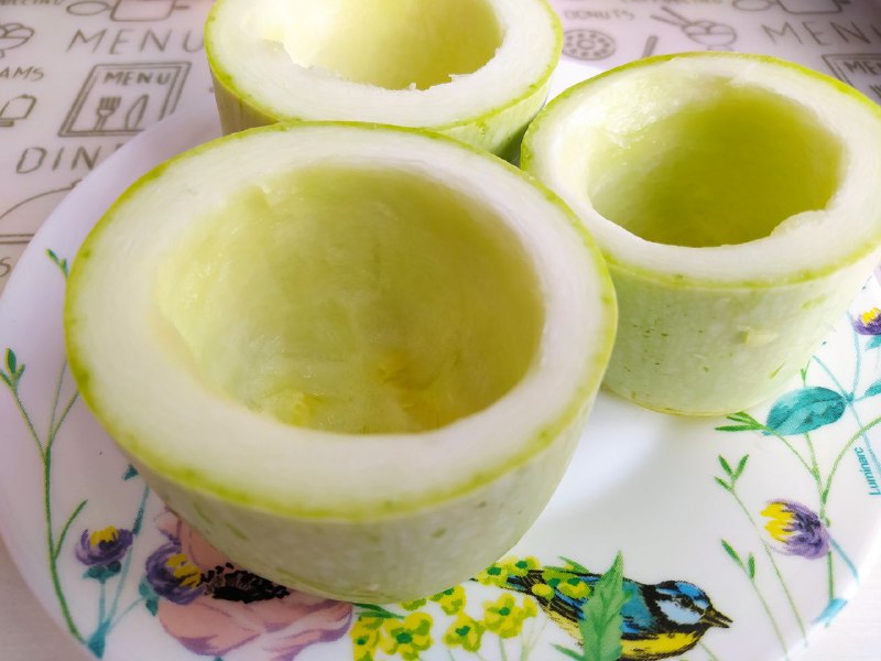 1). Кабачок вымыть, просушить, разрезать на 3-4 части. При помощи ложки достать сердцевину, оставив при этом донышко. Получились своеобразные стаканчики.