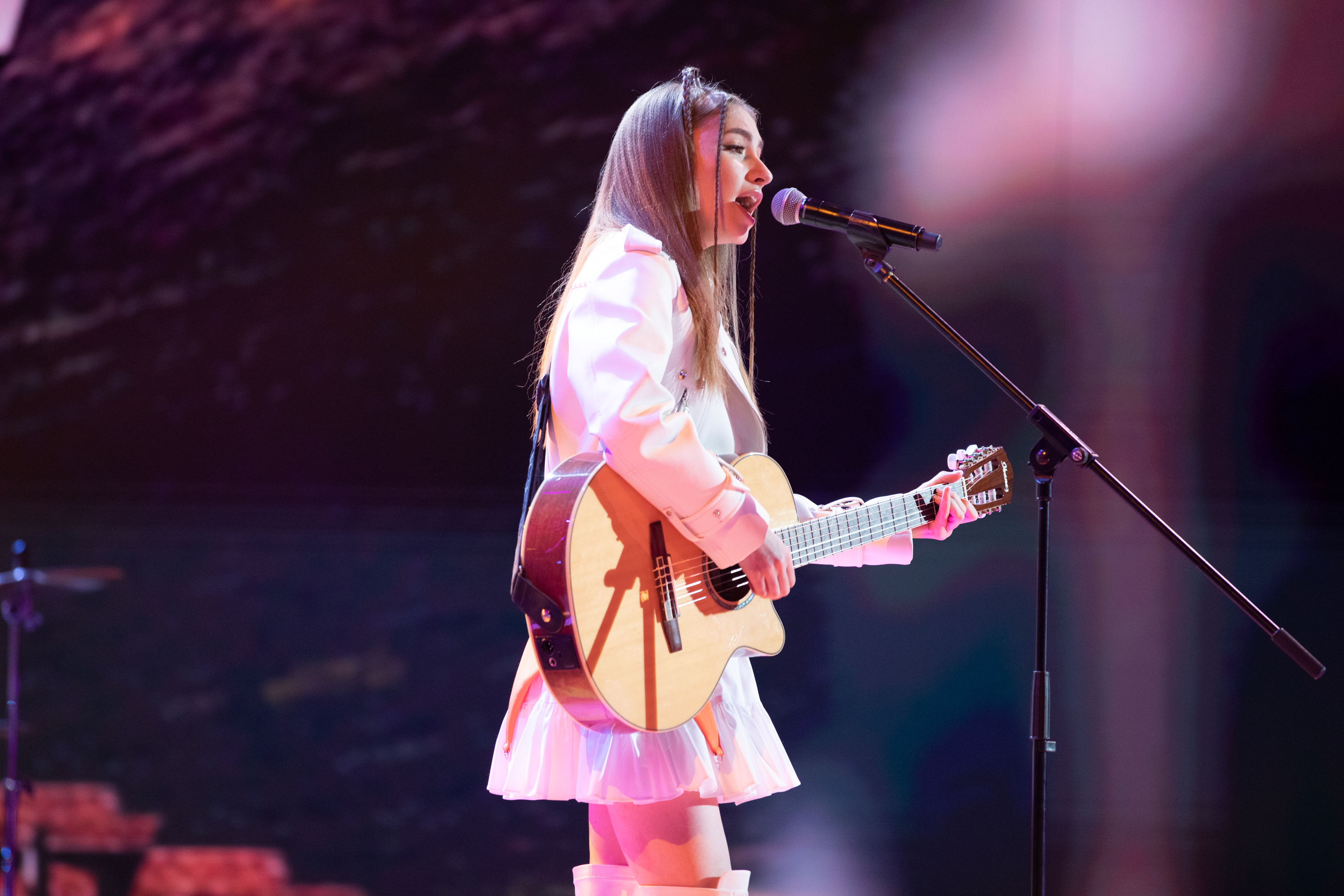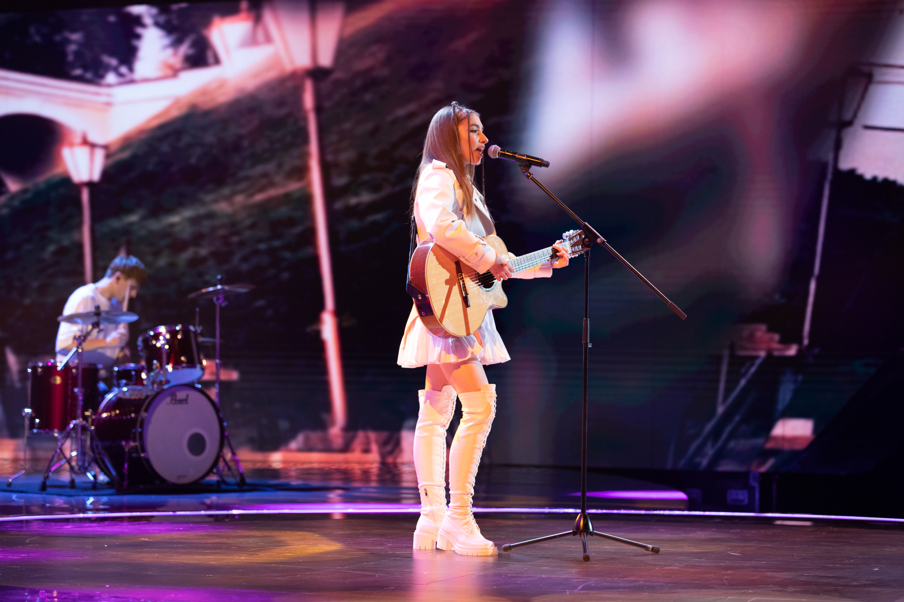 Далее исполнила свою авторскую песню Арина Лукашевич. Ее продюсером является Евгений Олейник. Девушка даже сама сыграла на гитаре. Такой вот полет творчества случился в едином номере!