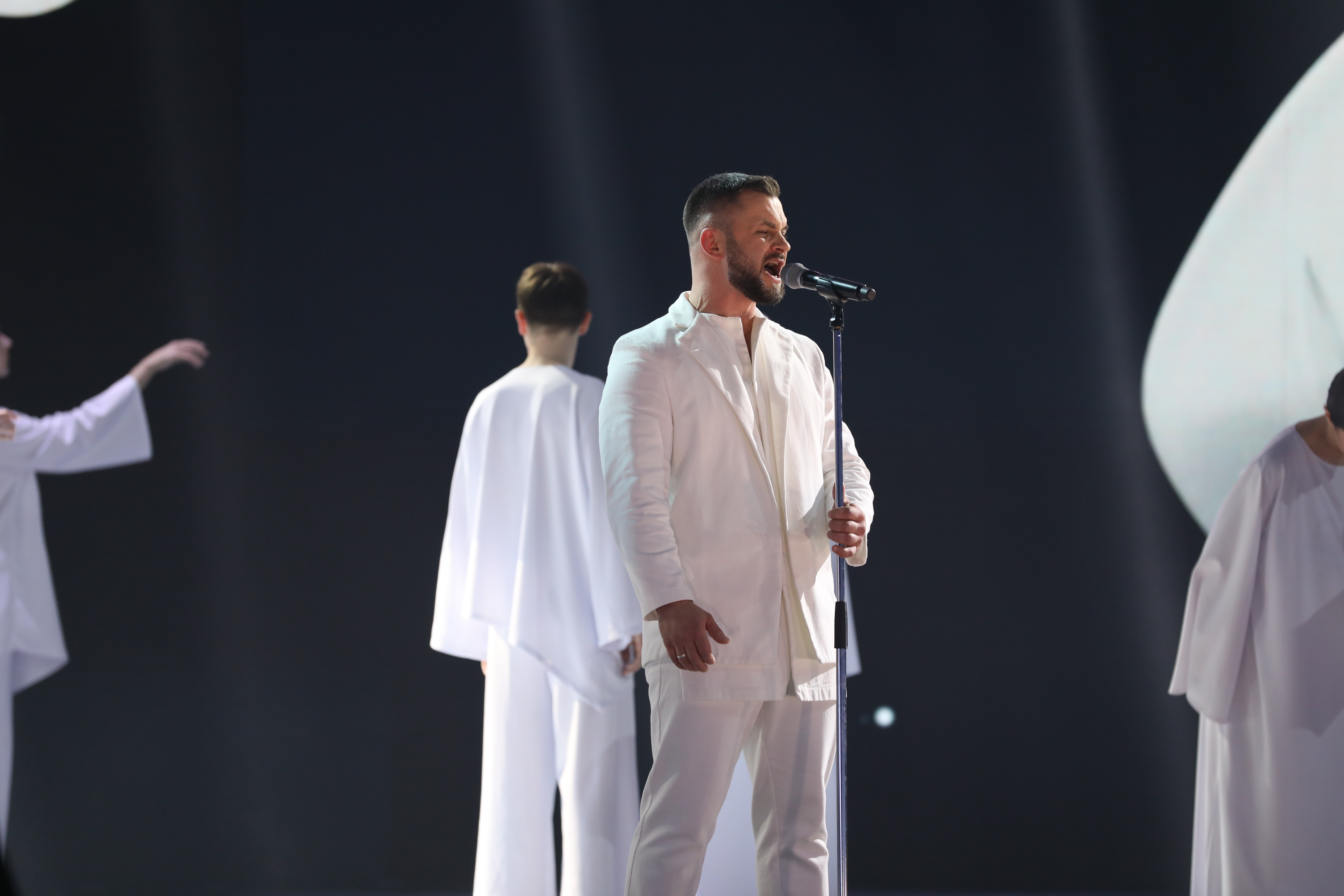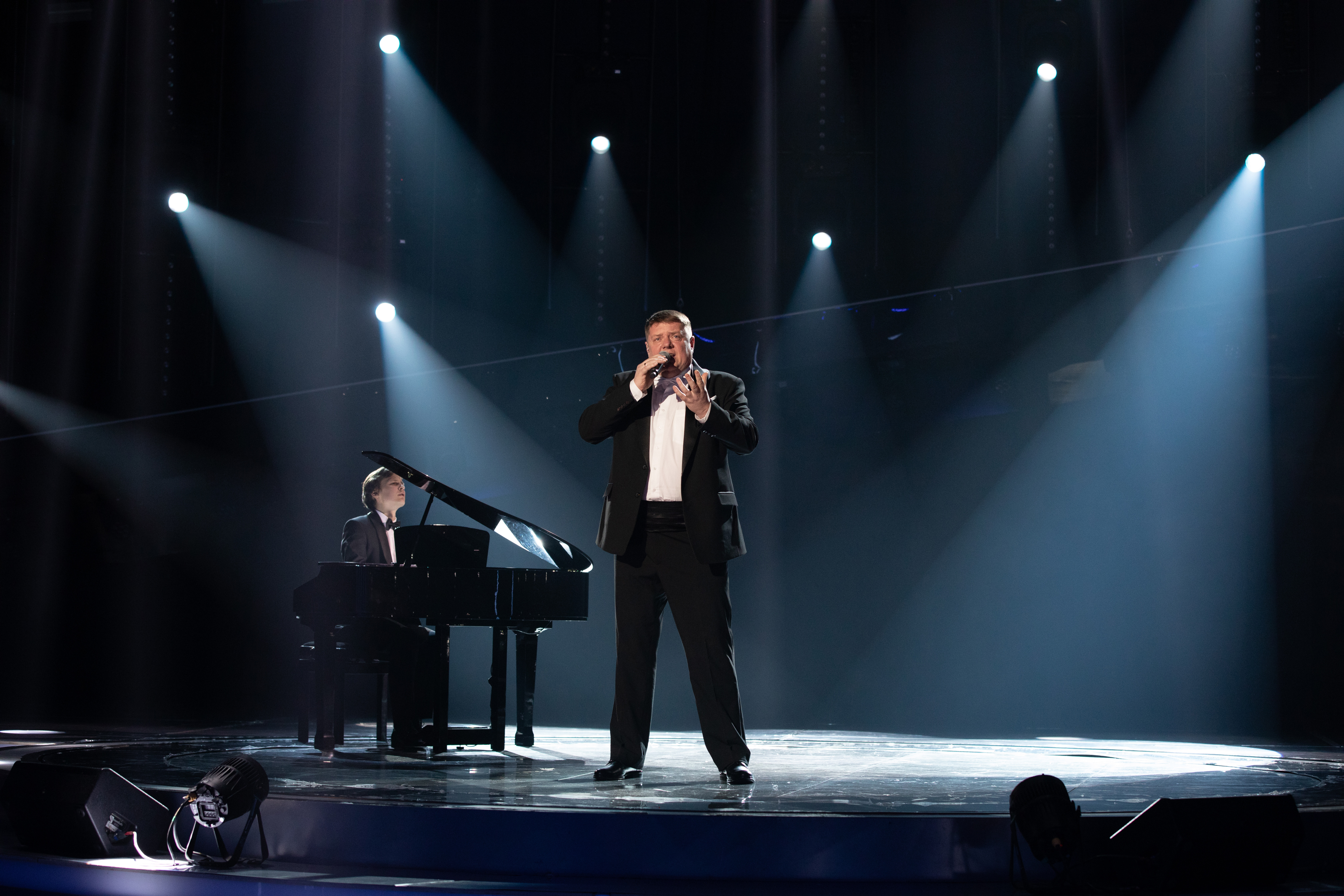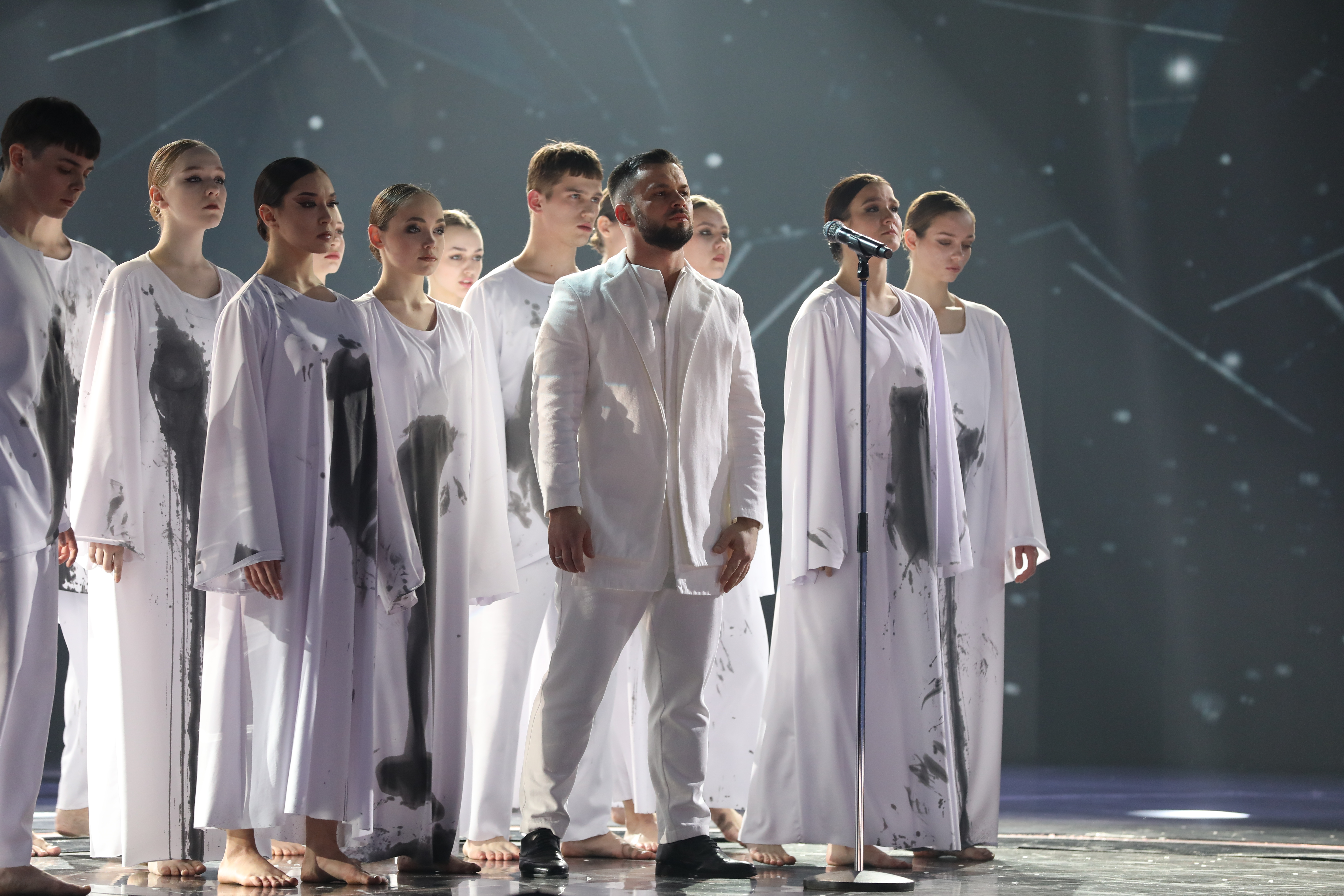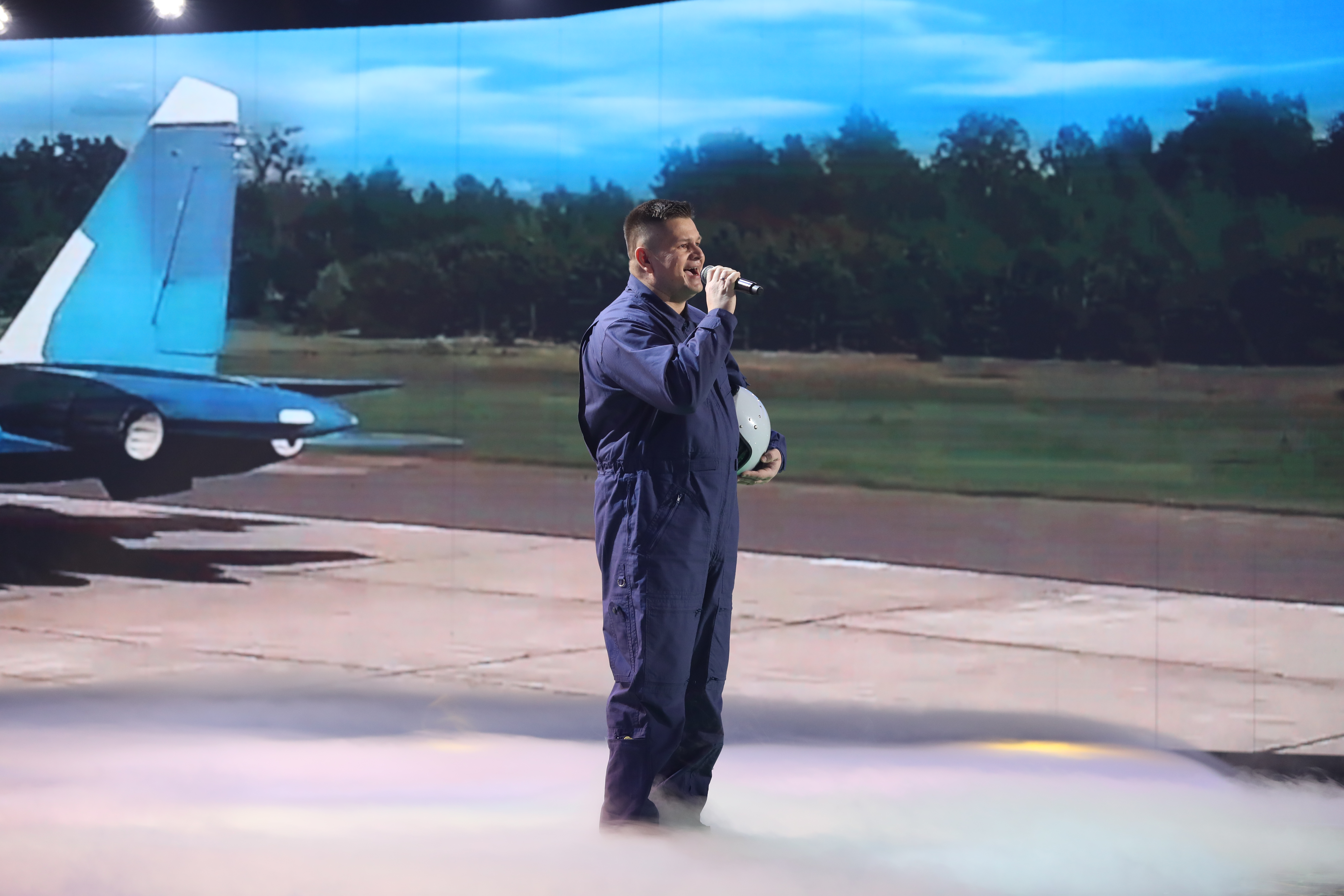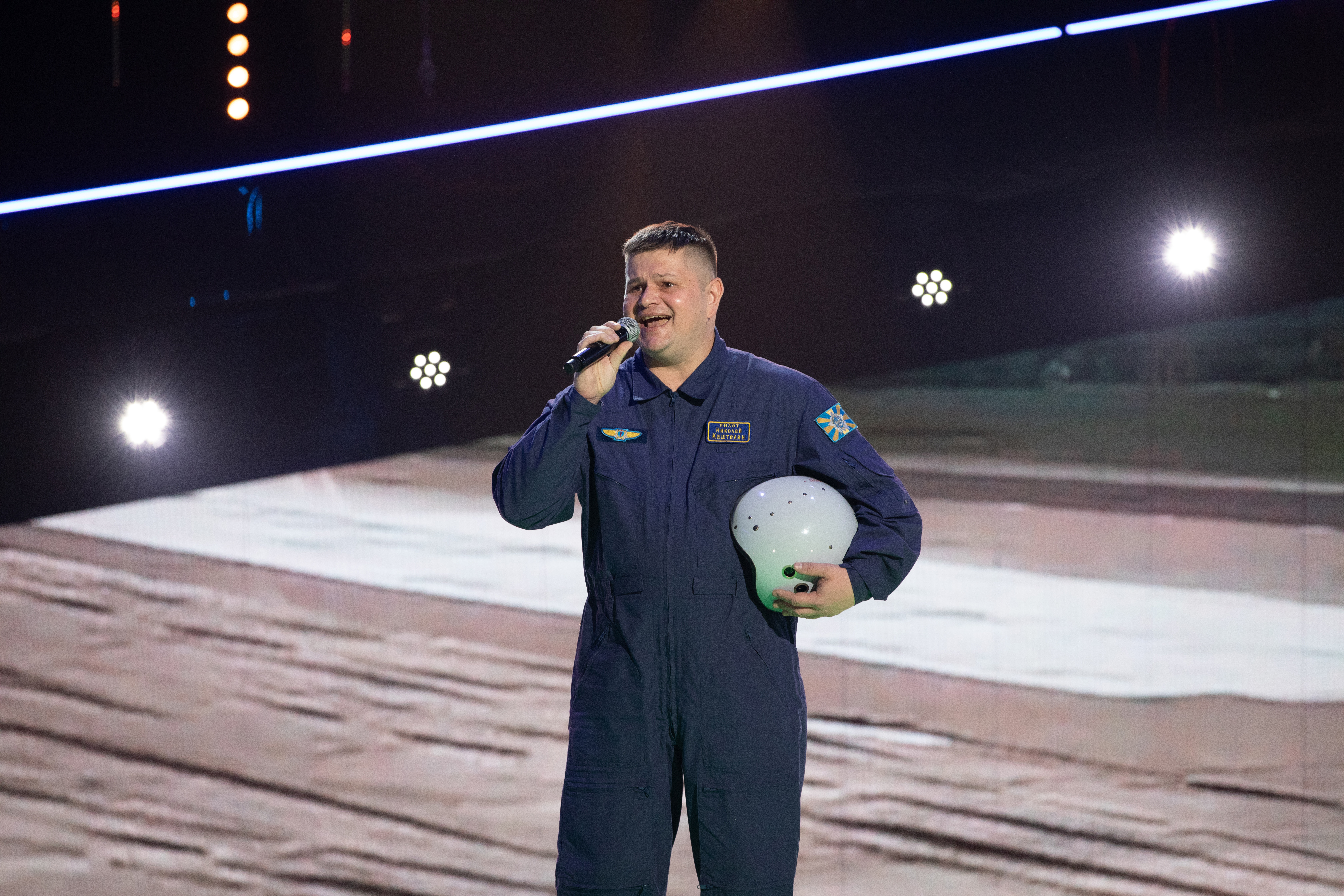 Первым на сцену вышел Василий Ларченко из команды Александра Лавриновича. Он выступил с песней «Под единым небом». Трогательный и проникновенный номер!