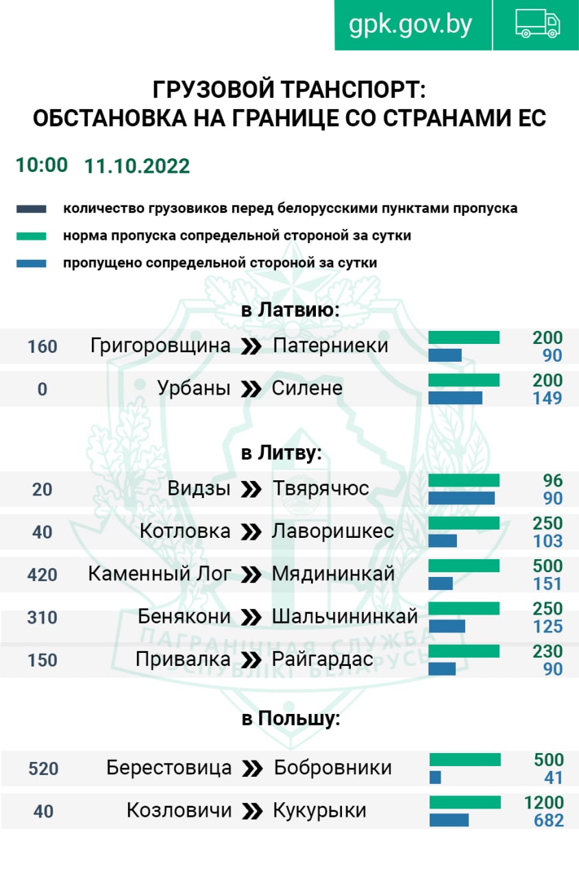 Наибольшее количество грузовиков на въезд в Евросоюз было зафиксировано перед сопредельным погранпереходом «Бобровники» («Берестовица»). По этому маршруту проследовало всего 8% грузового транспорта от пропускной способности.