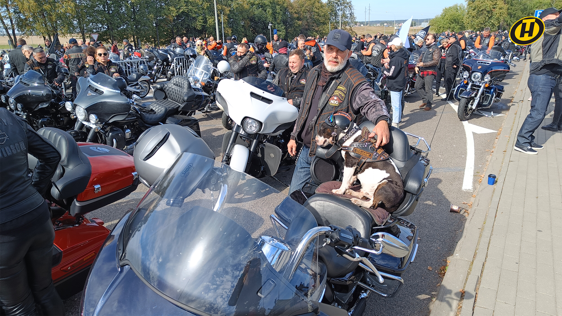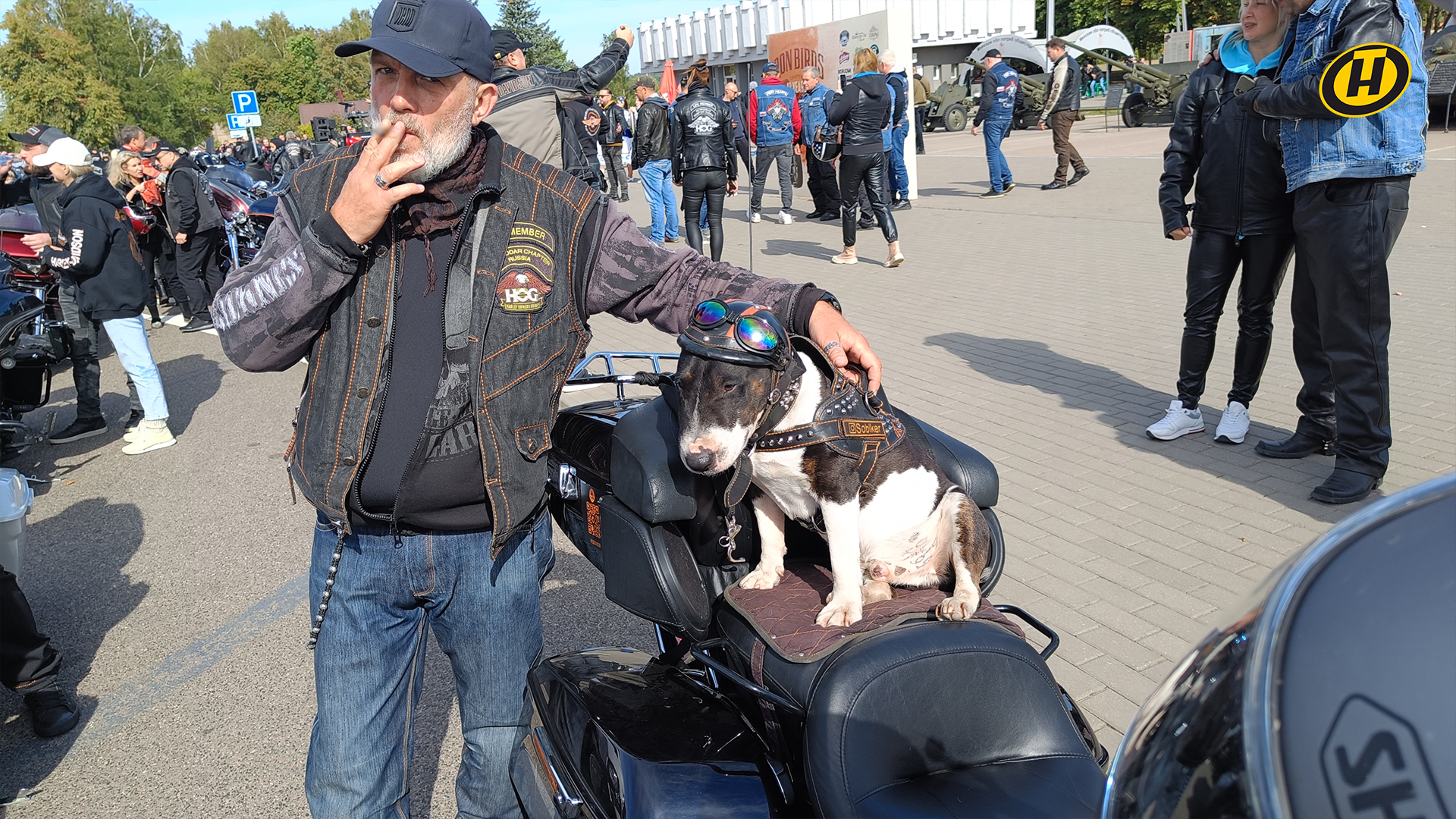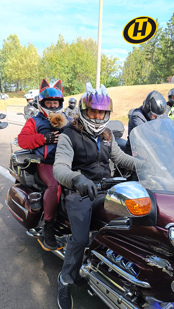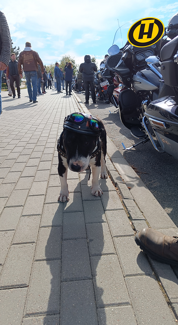 Среди брутальных мужчин был замечен и Ведя – собака-байкер с пятилетним стажем на мотоцикле.