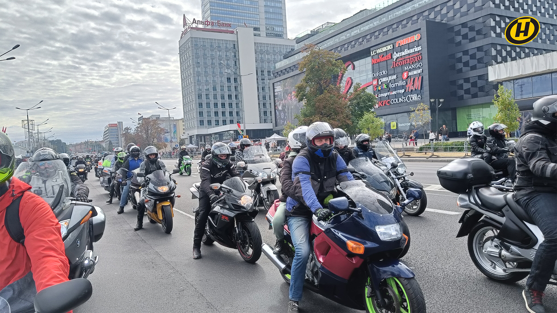 Старт мотопараду был дан в 12:00. Тысячи байкеров сорвались с места и в одной колонне проехали до Дворца спорта.