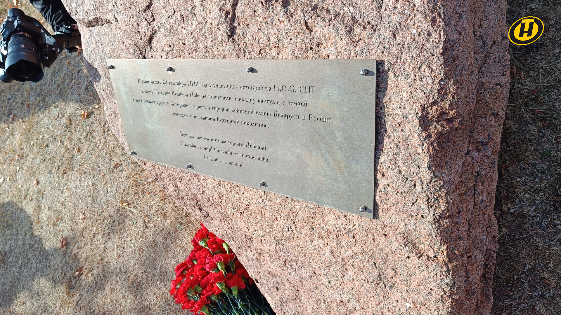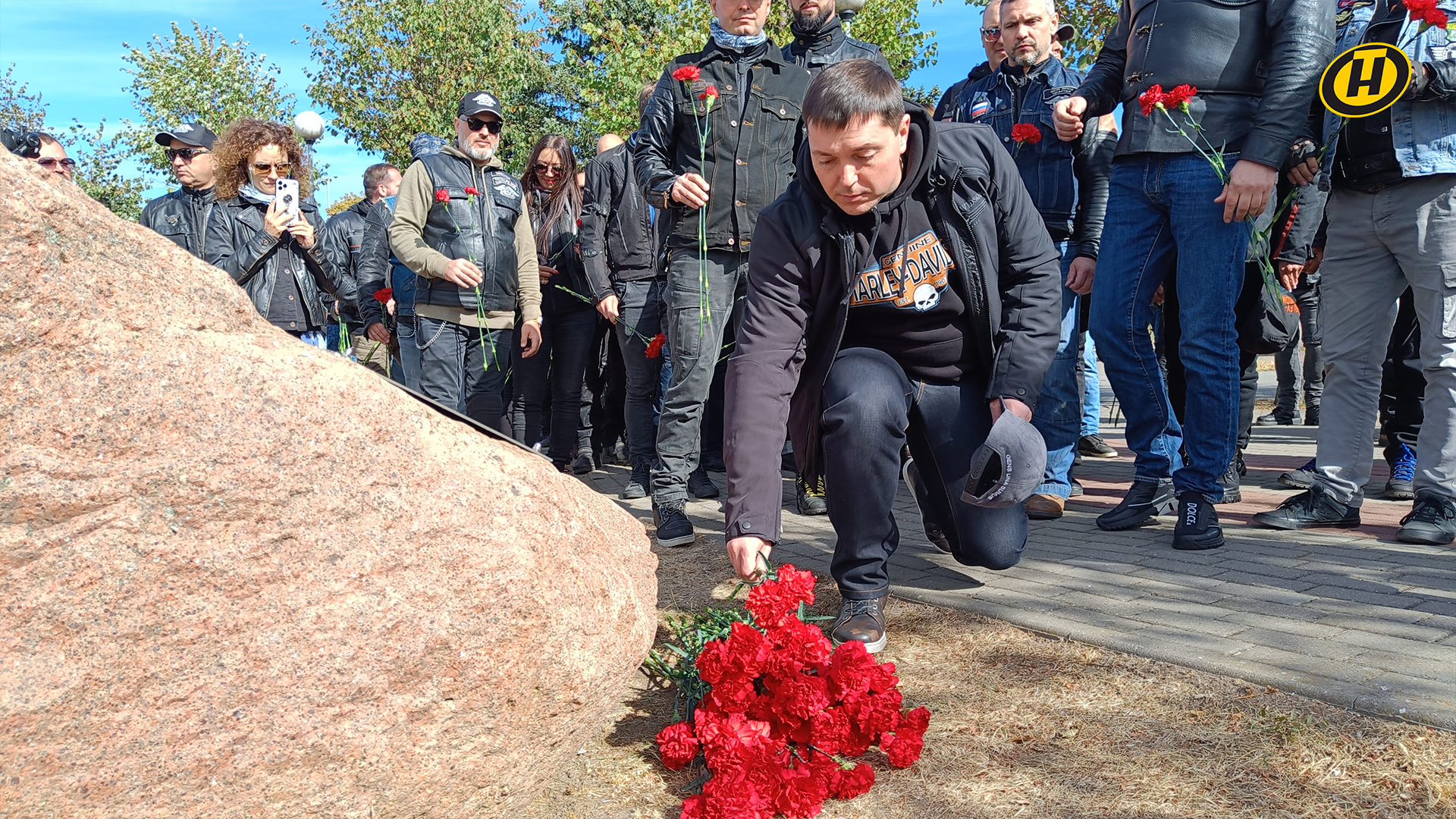 Перед стартом колонны в город президент НОК Беларуси Виктор Лукашенко вместе с мотоциклистами возложил цветы к памятному камню в честь 75-летия Великой Победы у мемориала «Курган Славы».