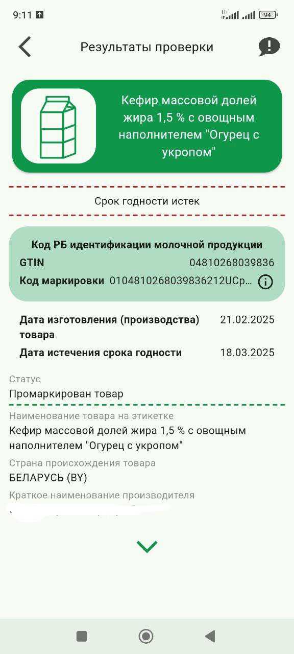 Проверить, как работает приложение, мы решили на кефире от одного из белорусских производителей, который уже давно стоит в холодильнике. Наводим телефон на маркировку, нанесенную на крышечке бутылки, – и понимаем, что срок годности этого кефира уже вышел.