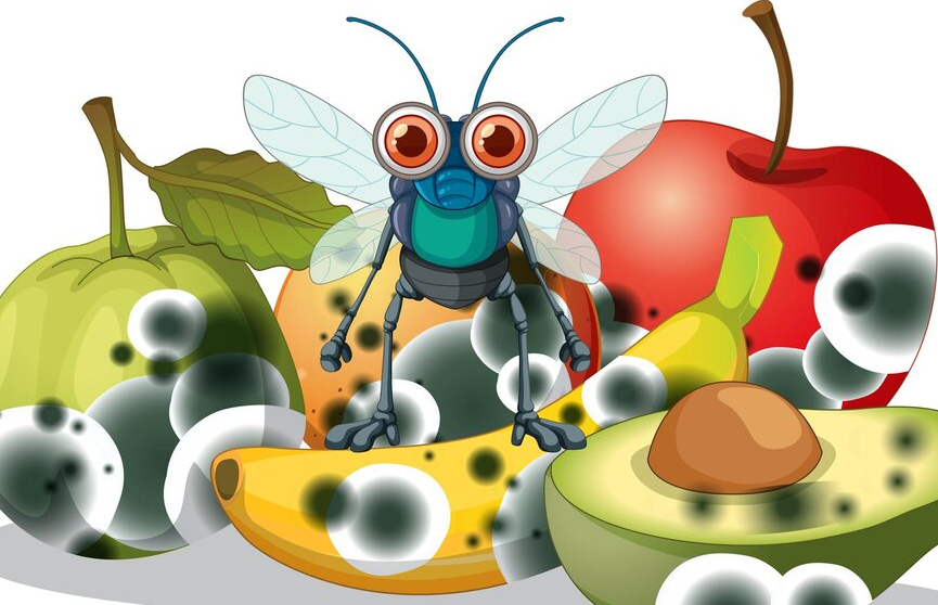 Эти насекомые могут быть опасны для продуктов. Они легко проникают в испорченные фрукты и овощи и откладывают там свои личинки, что делает пищу непригодной для употребления.