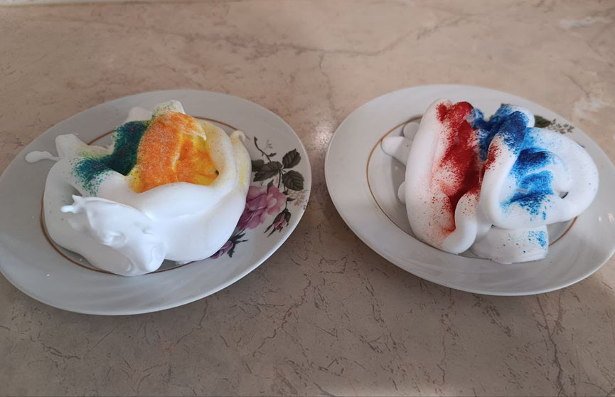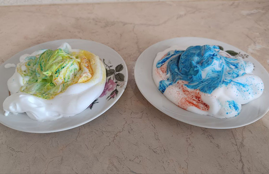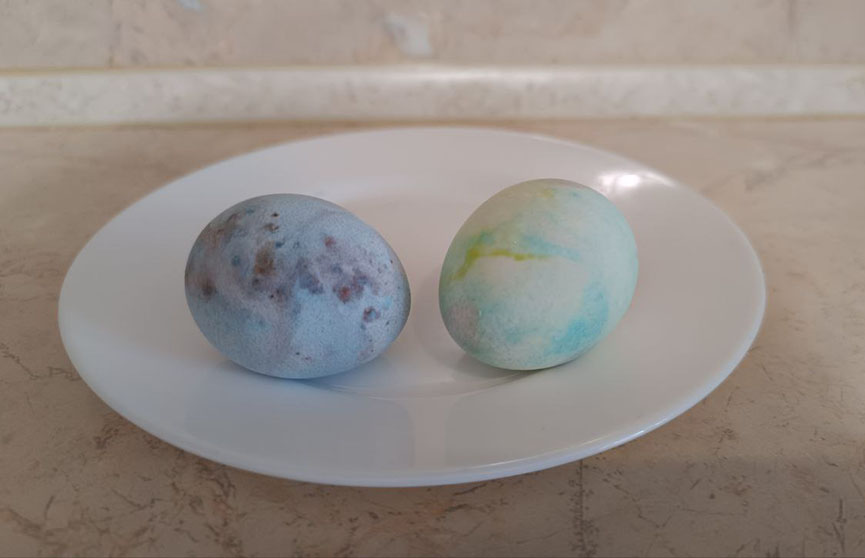 Мы для эксперимента использовали порошковые красители, но в этом способе покраски яиц больше подойдут жидкие. Кристаллики порошкового не очень хорошо растворяются в пене, поэтому результат не совсем оправдал наши ожидания. Но в целом получилось неплохо.