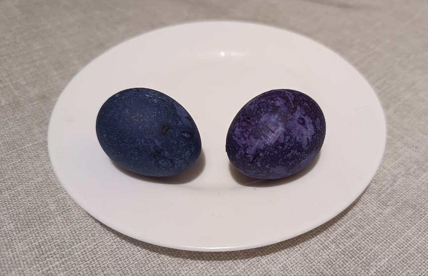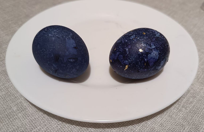 Как только яйца обсохнут, снимаем прилипшие частички каркаде. «Космические» яйца готовы! К слову, те, что красились в воде с уксусом, имеют темно-синий оттенок (на фото слева), без уксуса – темно-фиолетовый оттенок.