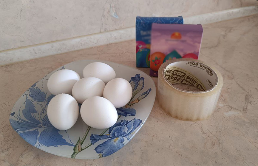 Нам понадобится: заранее сваренные яйца, пищевые красители, скотч, ножницы, стакан.