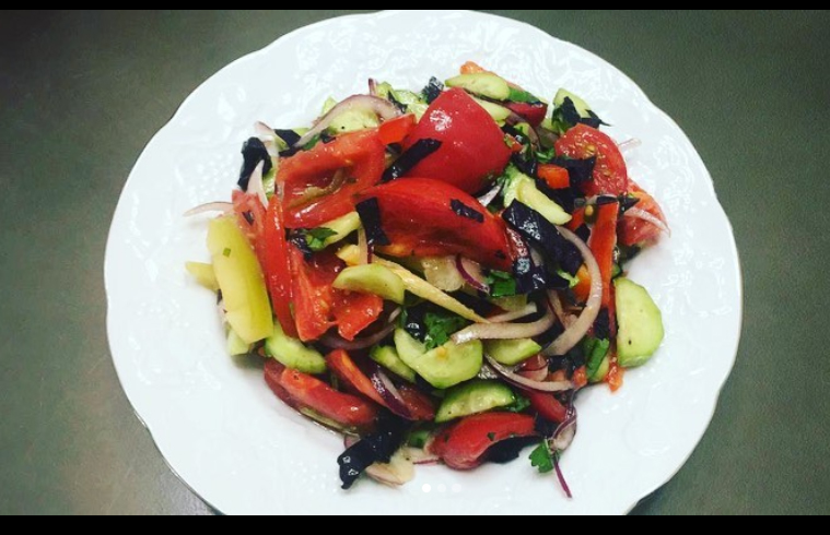 В детстве мы ели этот салат на завтрак, обед и ужин — готовили его, фактически не выходя из огорода: все нарвали с грядки, тут же помыли из шланга, нарезали, заправили — и уплетали его с белым батоном, с лавашом или с бабушкиными лепешками.