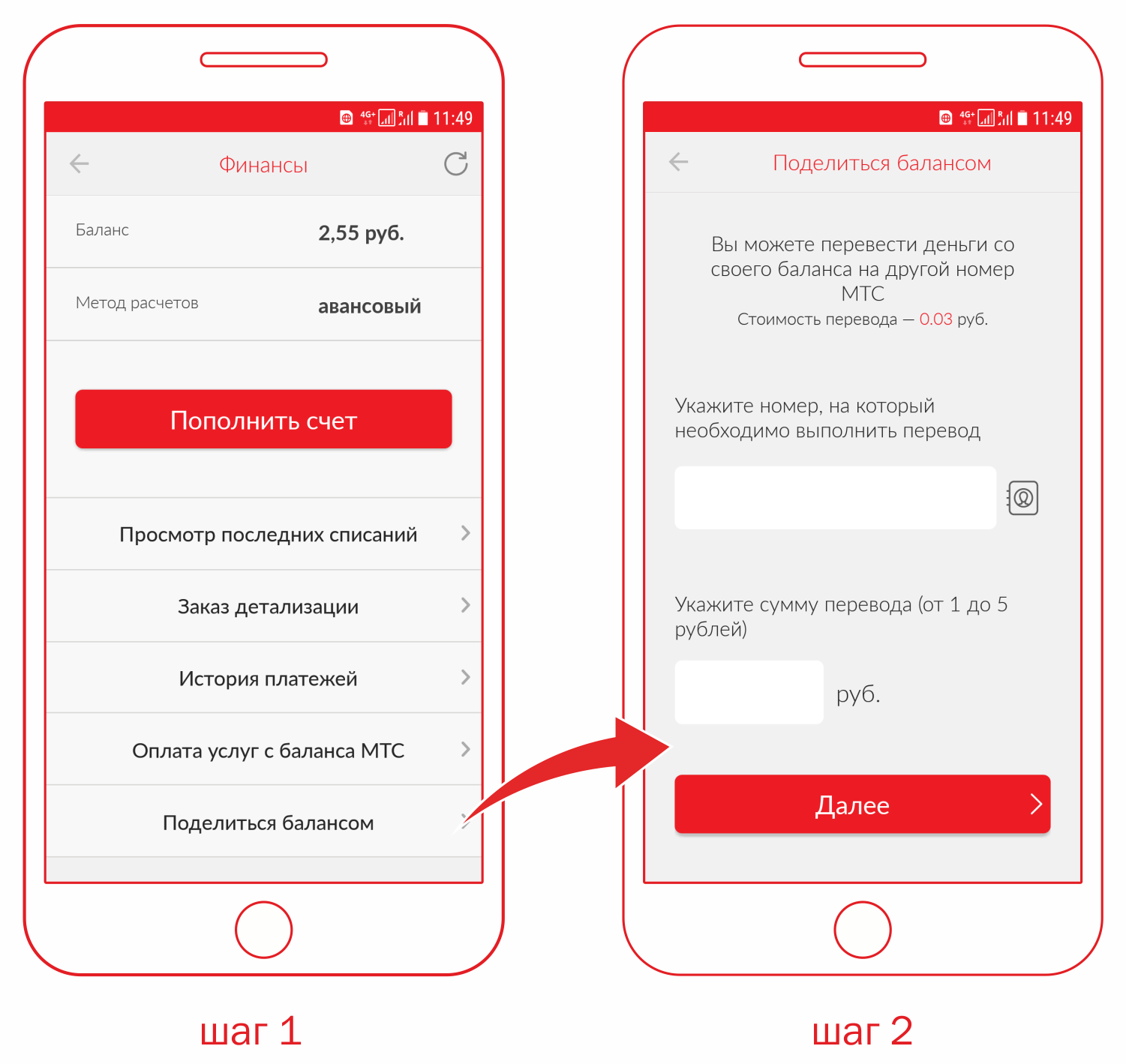 Также «Мой МТС» позволяет быстро делиться деньгами со счета с друзьями, близкими или просто пополнять баланс другого номера: достаточно перейти через меню в раздел «Финансы», а потом выбрать «Поделиться балансом».