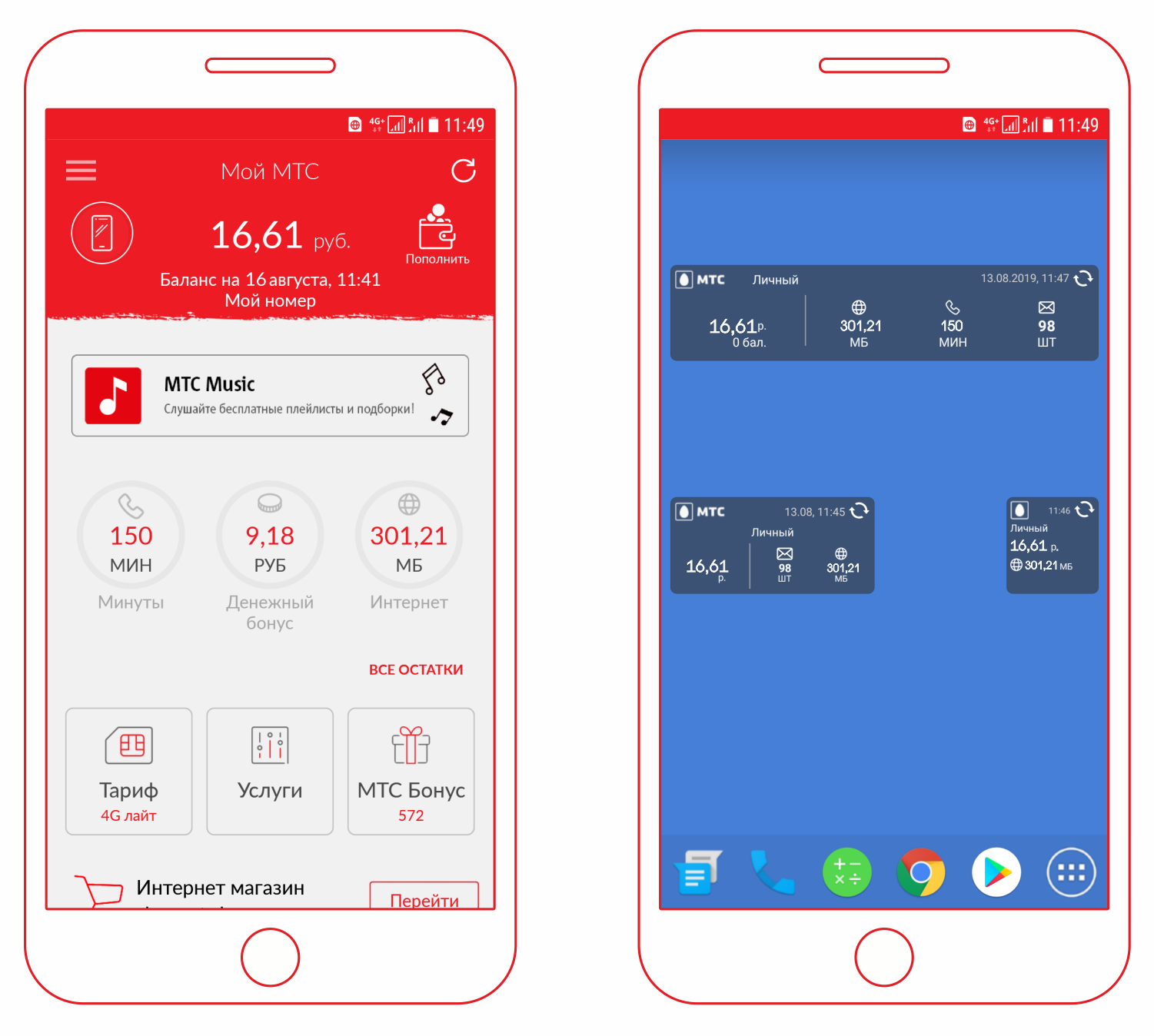 Даже при блокировке номера в «Мой МТС» можно проверить баланс и остатки трафика, зарегистрировать обещанный платеж. Эти же операции можно совершать с номерами родных и близких: приложение позволяет подключать дополнительные номера и полноценно ими управлять. Чтобы баланс и оставшийся мобильный трафик всегда были перед глазами, можно установить виджет на экране смартфона.