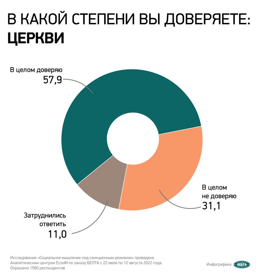 Результаты показали, что церкви доверяют 57,9%, не доверяет 31,1% опрошенных, затруднились ответить 11% граждан.